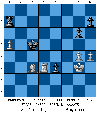 Last move : 1-0 2013 June 7 12:48:51 [Event "FICGS__CHESS__RAPID_D__000075"] [Site "FICGS"] [Date "2013.02.10"] [Round "1"] [White "Budnar,Milos"] [Black "Joubert,Hennie"] [Result "1-0"] [WhiteElo "1381"] [BlackElo "1454"] 1.e4 c5 2.Nf3 e6 3.d4 cxd4 4.Nxd4 Nf6 5.Nc3 Qb6 6.e5 Bc5 7.Na4 Qa5+ 8.c3 Nd5 9.Nxc5 Qxc5 10.Be2 Nxc3 11.Nb3 Qxe5 12.bxc3 Qxc3+ 13.Bd2 Qc7 14.O-O Nc6 15.Bc3 O-O 16.Bf3 d5 17.Re1 b6 18.g3 Bb7 19.Bg2 Rad8 20.Qg4 g6 21.Bf6 Rd7 22.Nd4 Nxd4 23.Qxd4 Re8 24.Bf1 a6 25.Rac1 Qd6 26.a4 Bc8 27.Be5 Qe7 28.Qxb6 f6 29.Ba1 Rd6 30.Rc6 Rxc6 31.Qxc6 Bb7 32.Qb6 e5 33.Bxa6 Bxa6 34.Qxa6 Qc5 35.Qb5 Rc8 36.Qxc5 Rxc5 37.Bb2 Ra5 38.Ra1 d4 39.Bc1 Kf7 40.Bd2 Ra6 41.a5 Ke6 42.Rb1 Ra7 43.h4 f5 44.Kg2 Kd5 45.Rb5+ Ke4 46.f3+ Kd3 47.Be1 e4 48.fxe4 fxe4 49.g4 Ke2 50.Bf2 e3 51.Rb2+ Kd3 52.Be1 Ke4 53.Kg3 d3 54.Rb4+ Ke5 55.Bc3+ Kd5 56.Rd4+ Kc5 57.Rxd3 1-0 Sicilian : Anderssen variation Kingside Castling by player White (move 14) Kingside Castling by player Black (move 15) Player White won this chess game. Follow this game move after move (download)A great player and a great example for many. His book My 60 Memorable Games had a big impact on me. It is a shame he didn't continue to enrich the world of chess with his unparalleled understanding after 1972. (Jan Timman, about Bobby Fischer's death) Ja, ich habe einmal eine Blitzpartie gespielt, es war in einem Zug, 1929. --im Interview 1989 (Mikhail Moiseyevich Botvinik) Dejen al perfeccionista jugar por correo. (Yasser Seirawan) Les échecs, c'est l'imagination. (David Bronstein) There are lots of people who mistake their imagination for their memory. (Josh Bilings)