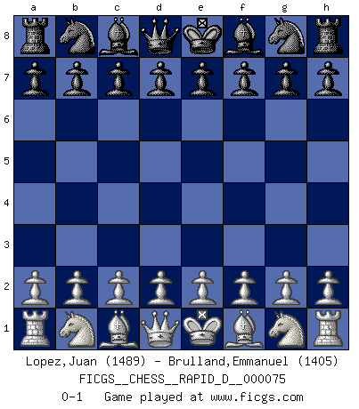 Last move : 0-1 2013 March 12 17:36:0 [Event "FICGS__CHESS__RAPID_D__000075"] [Site "FICGS"] [Date "2013.02.10"] [Round "1"] [White "Lopez,Juan"] [Black "Brulland,Emmanuel"] [Result "0-1"] [WhiteElo "1489"] [BlackElo "1405"] 0-1 This chess game has been lost on time (started : 2013.02.10 14:21:5) Player Black won this chess game. Follow this game move after move (download)I like the moment when I break a man's ego. (Bobby Fischer) Unter Putin wird alles Geld aus Russland wie von einem Staubsauger nach Moskau umgeleitet, das ist wie ein schwarzes Loch. (Garry Kasparov) El Peón aislado arroja penumbra sobre todo el tablero. (Aaron Nimzovich) Le jeu d'échecs fait naître et fortifie en nous plusieurs qualités précieuses dans le cours de l'existence, telles que la prévoyance, la circonspection, la prudence, et la persévérance. (Benjamin Franklin - 1783, la morale des échecs) A person who never made a mistake never tried anything new. (Albert Einstein)