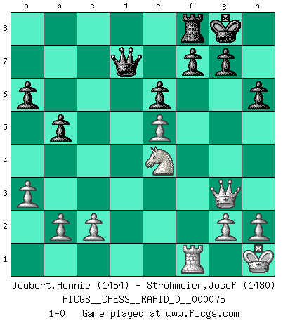 Last move : 1-0 2013 June 1 12:44:52 [Event "FICGS__CHESS__RAPID_D__000075"] [Site "FICGS"] [Date "2013.02.10"] [Round "1"] [White "Joubert,Hennie"] [Black "Strohmeier,Josef"] [Result "1-0"] [WhiteElo "1454"] [BlackElo "1430"] 1.e4 c5 2.Nf3 e6 3.d4 cxd4 4.Nxd4 Nf6 5.Nc3 a6 6.Be2 Nc6 7.O-O Qc7 8.Bg5 Be7 9.Kh1 O-O 10.f4 d6 11.Bf3 h6 12.Bh4 Bd7 13.Nxc6 Bxc6 14.Qe1 Ne8 15.Bxe7 Qxe7 16.Rd1 Qc7 17.Qg3 b5 18.a3 Nf6 19.e5 dxe5 20.fxe5 Nd7 21.Bxc6 Rad8 22.Bxd7 Rxd7 23.Rxd7 Qxd7 24.Ne4 1-0 Sicilian : Anderssen variation Kingside Castling by player White (move 7) Kingside Castling by player Black (move 9) Player White won this chess game. Follow this game move after move (download)Fischer is under obligation to nobody. (Joseph Platz) Im Hotelzimmer gab es nur zwei Schaben. (Über die Turnierbedingungen) (Peter Swidler) Una buena memoria, concentración, imaginación y una fuerte voluntad, se requiere para llegar a ser un buen jugador. (Bobby Fischer) RxDa4 pat (...) He who fights with monsters should be careful lest he thereby become a monster. (Friedrich Nietzsche, Beyond Good and Evil)
