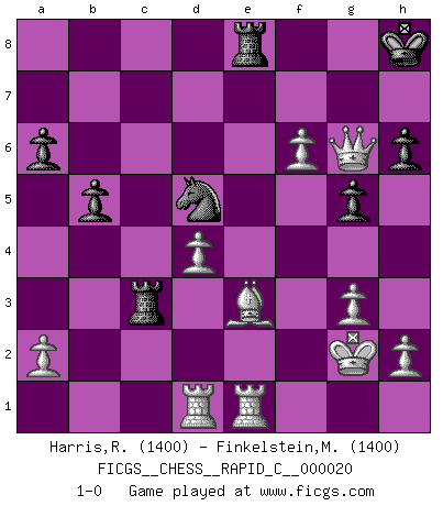 Last move : 1-0 2007 May 9 7:36:34 [Event "FICGS__CHESS__RAPID_C__000020"] [Site "FICGS"] [Date "2007.01.26"] [Round "1"] [White "Harris,Robert"] [Black "Finkelstein,Michael"] [Result "1-0"] [WhiteElo "1400"] [BlackElo "1400"] 1.c4 Nf6 2.Nc3 e5 3.g3 d5 4.cxd5 Nxd5 5.Bg2 Nxc3 6.bxc3 Nc6 7.Qc2 Be7 8.Nf3 O-O 9.O-O Bf6 10.Rb1 Qe7 11.d3 Rb8 12.Nd2 Bd7 13.Ne4 b6 14.Nxf6+ Qxf6 15.f4 Rfe8 16.fxe5 Qxe5 17.e4 Qh5 18.Bf4 Ne5 19.d4 Nc4 20.Qd3 b5 21.Bxc7 Rbc8 22.Bf4 a6 23.Rfe1 f6 24.Rb4 Kh8 25.Reb1 Bg4 26.Qf1 Nb6 27.Rc1 Na4 28.Rb3 Be2 29.Qf2 Bc4 30.Qd2 Rcd8 31.Qc2 Rc8 32.R3b1 Be2 33.Qd2 Bf3 34.e5 Bxg2 35.Kxg2 Nb6 36.Re1 g5 37.Be3 Qg6 38.Rbd1 Nd5 39.exf6 h6 40.Qd3 Rxc3 41.Qxg6 1-0 English Opening Kingside Castling by player Black (move 8) Kingside Castling by player White (move 9) Player White won this chess game. Follow this game move after move (download)Suddenly it was obvious to me in my analysis I had missed what Fischer had found with the greatest of ease at the board. (Mikhail Botvinnik) Der zweitbeste Zug ist oft der einzig richtige. (Savielly Grigorievitsch Tartakower) Si tu oponente te ofrece un empate, trata de averiguar porque piensa él que esta en una posición peor. (Nigel Short) Seul un grand joueur sait à quel point il joue faiblement. (Xavier Tartacover) I'll be back. (Arnold Schwarzenegger)