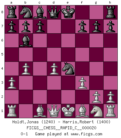 Last move : 0-1 2007 March 22 13:49:6 [Event "FICGS__CHESS__RAPID_C__000020"] [Site "FICGS"] [Date "2007.01.26"] [Round "1"] [White "Holdt,Jonas"] [Black "Harris,Robert"] [Result "0-1"] [WhiteElo "1240"] [BlackElo "1400"] 1.d4 Nf6 2.c4 e6 3.f3 d5 4.cxd5 exd5 5.Nc3 Bb4 6.a3 Ba5 7.b4 Bb6 8.e4 dxe4 9.Nxe4 Nxe4 0-1 This chess game has been lost on time (started : 2007.01.26 15:32:5) Queen's pawn game Player Black won this chess game. Follow this game move after move (download)Nowadays, when you're not a grandmaster at 14, you can forget about it. (Anand Viswanathan) Ein Gewinn durch eine ungenaue Kombination, sei sie auch noch so vorzeigbar, erfüllt mich mit Schaudern. (Wilhelm Steinitz) Yo considero que Fischer es uno de los expertos mas grandes de aperturas de siempre. (Keith Hayward) Les Echecs ont trois composantes : le temps, l'espace et le matériel en dernier. (Mikhail Tal) There are two kinds of tragedy in this world, one is not getting what you want and the other is getting. (Lord of war)