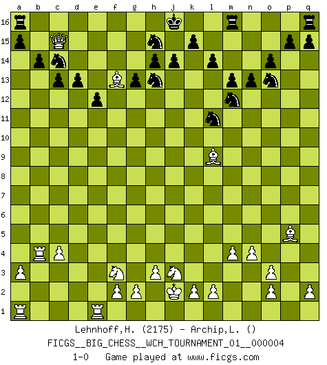Last move : 1-0 2013 March 27 7:4:1 [Event "FICGS__BIG_CHESS__WCH_TOURNAMENT_01__000004"] [Site "FICGS"] [Date "2013.02.11"] [Round "1"] [White "Lehnhoff,Heinz-Georg"] [Black "Archip,Laurentiu"] [Result "1-0"] [WhiteElo "2175"] [BlackElo ""] 1.j2-k4 e15-e13 2.e2-e4 d15-d13 3.m2-m4 f16-b12 4.h1-o7 o15-o14 5.o7-f15 e16-e14 6.f15-l10 k16-l14 7.d2-d4 b12-k4 8.j3-k4 c15-c13 9.n2-n4 j15-k13 10.g1-j2 l14-m12 11.l10-j8 g16-f14 12.c1-n11 n15-n13 13.b1-a3 o16-a3 14.b2-a3 m15-m13 15.o1-f9 l15-l14 16.a1-b1 l16-o13 17.j8-j7 h16-l13 18.k1-j3 b15-b14 19.e1-e3 l13-f8 20.e3-f3 f8-a8 21.j2-g3 o13-e4 22.g3-e4 a8-e4 23.f1-d3 e4-d4 24.l1-p5 d4-k4 25.p1-o3 c16-a14 26.f9-h11 e14-e16 27.b1-b4 k4-k11 28.h11-j12 k11-a2 29.j12-e16 f14-e16 30.j7-f10 p16-n15 31.d3-k9 a14-n2 32.m1-n1 n2-o3 33.p2-o3 e16-f14 34.f10-g9 n15-o13 35.n11-l9 g15-g13 36.j1-j2 b16-c14 37.c2-c4 a2-e2 38.n1-e1 e2-a2 39.e1-a1 a2-e2 40.q1-e1 e2-f3 41.h2-f3 k13-l11 42.k9-f13 e13-e12 43.g9-g11 f14-h13 44.g11-c15 1-0 Follow this game move after move (download)Spassky will not be psyched out by Fischer. (Mike Goodall) Ich war schon mal beim Dopingtest. Da musste ich Urin abgeben, während Dritte zusahen. (Elisabeth Pähtz) En el tablero, la mentira e hipocresía no sobreviven mucho. (Emanuel Lasker) J'ai toujours senti une vague pitié pour l'homme qui ne connaît rien aux échecs, tout comme j'en aurais pour un homme ignorant de l'amour. Les Echecs, comme la musique ou comme l'amour, ont le pouvoir de rendre heureux. (Siegbert Tarrasch) To err is human, to shift the blame on someone else is tactical. (Mladen Jankovic)