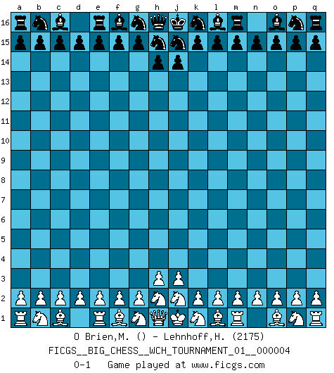 Last move : 0-1 2013 March 14 5:40:7 [Event "FICGS__BIG_CHESS__WCH_TOURNAMENT_01__000004"] [Site "FICGS"] [Date "2013.02.11"] [Round "1"] [White "O Brien,Matthew"] [Black "Lehnhoff,Heinz-Georg"] [Result "0-1"] [WhiteElo ""] [BlackElo "2175"] 0-1 This big chess game has been lost on time (started : 2013.02.11 20:18:47) Follow this game move after move (download)One of these modest little moves may be more embarrassing to your opponent than the biggest threat. (Siegbert Tarrasch) Wie ich sie so einen nach dem anderen nieder mähte wurde meine Überlegenheit offensichtlich. (José Raúl Capablanca) Me dio la sensación de como si yo estuviera jugando en contra del mismo Ajedrez. - al estar jugando en contra de Robert Fischer (Walter Shipman) En blitz, le Cavalier l'emporte sur le Fou. (Vlastimil Hort) History is the quarrels of popes and kings, with wars or pestilences in every page; the men all so good for nothing, and hardly any women at all. (Jane Austen)