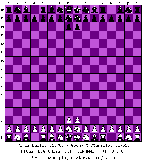 Last move : 0-1 2013 March 14 5:40:7 [Event "FICGS__BIG_CHESS__WCH_TOURNAMENT_01__000004"] [Site "FICGS"] [Date "2013.02.11"] [Round "1"] [White "Perez,Dailos"] [Black "Gounant,Stanislas"] [Result "0-1"] [WhiteElo "1778"] [BlackElo "1761"] 0-1 This big chess game has been lost on time (started : 2013.02.11 20:18:47) Follow this game move after move (download)There are two classes of men; those who are content to yield to circumstances and who play whist; those who aim to control circumstances, and who play Chess. (Mortimer Collins) Was ist der Unterschied zwischen einem Strassenarbeiter und einem Schachspieler? --Der Schachspieler bewegt sich ab und zu. (Anonymous) Uno no tiene que jugar muy bien, es suficiente jugar mejor que el oponente. (Siegbert Tarrasch) Ce n'est pas pour s'amuser qu'il joue aux échecs : il célèbre un culte. (Vladimir Nabokov) Shallow men believe in luck. Strong men belive in cause and effect. (Ralph Waldo Emerson)