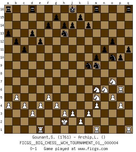 Last move : 0-1 2013 March 22 8:27:12 [Event "FICGS__BIG_CHESS__WCH_TOURNAMENT_01__000004"] [Site "FICGS"] [Date "2013.02.11"] [Round "1"] [White "Gounant,Stanislas"] [Black "Archip,Laurentiu"] [Result "0-1"] [WhiteElo "1761"] [BlackElo ""] 1.j2-k4 e15-e13 2.m2-m4 d15-d13 3.l1-o4 j15-h13 4.n2-n3 c15-c13 5.e2-e4 b16-c14 6.f1-c4 p16-o14 7.d2-d3 b15-b13 8.o1-g8 b13-b12 9.c1-k8 f15-f14 10.b1-c3 a15-a13 11.h1-l4 l15-l14 12.p1-o3 q15-q13 13.g1-j2 p15-p14 14.k1-l3 o16-q14 15.k8-q14 q16-q14 16.l4-j6 h16-p9 17.o4-p3 m15-m13 18.g8-k11 g16-j15 19.e1-e3 c16-a14 20.j6-k7 e16-d16 21.e3-g3 l16-p12 22.k7-c7 q14-q16 23.a1-e1 c13-c12 24.f2-f4 f16-d14 25.f4-f5 e13-e12 26.p3-d14 d16-d14 27.c7-l7 d14-d16 28.h2-j4 p9-p2 29.l7-p3 p2-p3 30.q2-p3 h15-j13 31.k11-f7 p12-k7 32.n3-n4 c12-c11 33.o3-n5 a14-e10 34.f7-g8 e10-f11 35.q1-q9 k7-n4 36.l3-n4 f11-n4 37.l2-l3 c14-d12 38.g8-h9 n4-h9 39.c4-h9 n15-n13 40.q9-o9 k16-m15 41.g3-g9 q16-o16 42.j1-h2 o14-n12 43.c3-d5 o15-o13 44.j2-h4 p14-p13 45.g2-g4 o13-o12 46.c2-c4 q13-q12 47.b2-b4 q12-q11 48.b4-b5 p13-p12 49.a2-a4 d12-e10 50.g9-g6 e10-f8 51.g6-p6 f8-h9 52.o9-h9 p12-p11 53.h9-q9 n12-o10 54.q9-q1 o16-q16 55.d5-f6 m13-m12 56.f6-h5 m15-l13 57.o2-o4 n13-n12 58.h4-k5 p11-p10 59.p3-p4 n12-n11 60.j4-l5 j15-k13 61.h5-k6 m12-m11 62.k4-m5 m11-m10 63.o4-o5 l13-m11 64.k5-m6 k13-l11 65.l5-n6 l11-m9 66.k6-m7 j13-k11 67.n5-o7 k11-l9 68.m7-l9 m11-l9 0-1 Follow this game move after move (download)You are for me the Queen on d8 and I am the Pawn on d7 !! (Eduard Gufeld) Es ist besser die Steine des Gegners zu opfern. (Savielly Grigorievitsch Tartakower) Si el Ajedrez es una ciencia, es la mas inexacta. Si el Ajedrez es un arte, es demasiado inexacto para ser visto como tal. Si el Ajedrez es un deporte, es demasiado esotérico. Si el Ajedrez es un juego, es demasiado exigente para ser solo un juego. Si el Ajedrez es una aventura, es una muy demandante. Si el Ajedrez es una pasión, es una muy gratificante. Si el Ajedrez es la vida, es una muy triste. (Anónimo) Shah mat. Le roi est mort. Cri de fierté d'un joueur venant de terrasser son adversaire, courtoisement, sans effusion de sang. Are you threatening me, Master Jedi ? (Chancellor Palpatine in Star Wars ep.3)