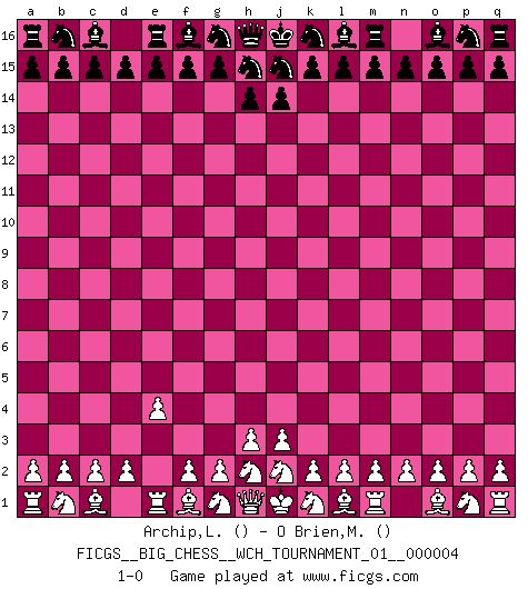 Last move : 1-0 2013 March 14 5:40:7 [Event "FICGS__BIG_CHESS__WCH_TOURNAMENT_01__000004"] [Site "FICGS"] [Date "2013.02.11"] [Round "1"] [White "Archip,Laurentiu"] [Black "O Brien,Matthew"] [Result "1-0"] [WhiteElo ""] [BlackElo ""] 1.e2-e4 1-0 This big chess game has been lost on time (started : 2013.02.11 20:18:47) Follow this game move after move (download)I look one move ahead... the best ! (Siegbert Tarrasch) Lisa Lane, amerikanische Schachmeisterin, hatte Fischer einmal als stärksten lebenden Spieler bezeichnet. Antwort: Das ist richtig, aber Lisa Lane ist eigentlich nicht in der Lage, das zu beurteilen. (Robert James Fischer) El Rey es una pieza de pelea. ¡Usenlo!. (Wilhelm Steinitz) Aucun coup ne doit être joué sans but. (Pedro Damiano) It is a good thing for an uneducated man to read books of quotations. (Winston Churchill)