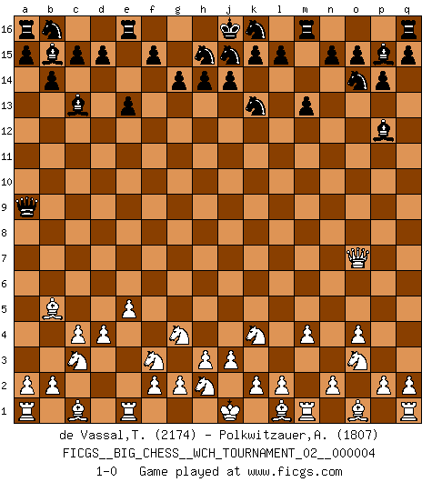 Last move : 1-0 2013 May 6 21:38:39 [Event "FICGS__BIG_CHESS__WCH_TOURNAMENT_02__000004"] [Site "FICGS"] [Date "2013.02.11"] [Round "1"] [White "de Vassal,Thibault"] [Black "Polkwitzauer,Ardiantez"] [Result "1-0"] [WhiteElo "2174"] [BlackElo "1807"] 1.j2-k4 j15-k13 2.h1-o7 g15-g14 3.h2-g4 p16-o14 4.e2-e4 b15-b14 5.o2-o4 c16-b15 6.p1-o3 p15-p14 7.f1-b5 g16-j15 8.c2-c4 h16-a9 9.e4-e5 o16-p15 10.g1-f3 m15-m13 11.m2-m4 l16-p12 12.k1-h2 e15-e13 13.d2-d4 f16-c13 14.b1-c3 1-0 Follow this game move after move (download)Before the endgame, the Gods have placed the middle game. (Siegbert Tarrasch) Ich verstehe mehr vom Schach als irgendein anderer lebender Meister. (José Raúl Capablanca) Robert Fischer es la ley hacia si mismo. (Larry Evans) Tout change constamment, y compris dans le monde des Echecs. (Botvinnik) Better than a thousand days of diligent study is one day with a great teacher. (Japanese proverb)