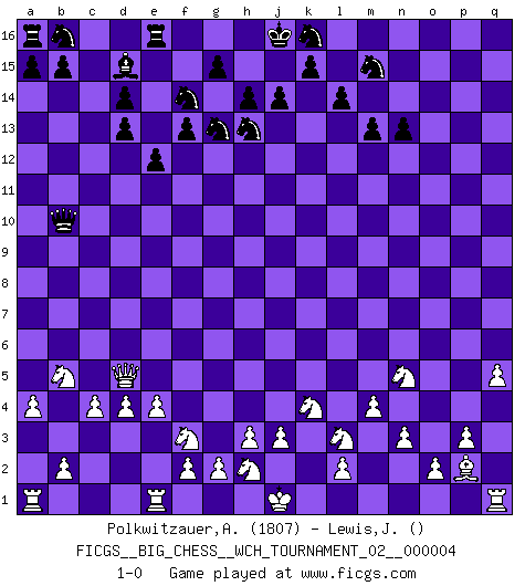 Last move : 1-0 2013 July 6 3:0:38 [Event "FICGS__BIG_CHESS__WCH_TOURNAMENT_02__000004"] [Site "FICGS"] [Date "2013.02.11"] [Round "1"] [White "Polkwitzauer,Ardiantez"] [Black "Lewis,John"] [Result "1-0"] [WhiteElo "1807"] [BlackElo ""] 1.j2-k4 m15-m13 2.h1-o7 j15-h13 3.p2-p3 d15-d13 4.o1-p2 e15-e14 5.b1-c3 l16-m15 6.d2-d4 q15-q13 7.o7-o15 p16-o14 8.m2-m4 q16-q15 9.o15-p14 q15-q14 10.c1-q14 p15-q14 11.l1-o4 f16-d14 12.o4-d14 c15-d14 13.e2-e4 m15-e8 14.f1-b5 e8-b5 15.c3-b5 m16-m14 16.p1-o3 h16-m12 17.p14-f5 f15-f13 18.m1-m3 h15-g13 19.g1-f3 m14-n14 20.n2-n3 n14-l14 21.m3-l3 l14-l3 22.k1-l3 m12-g7 23.f5-g5 g7-b7 24.a2-a4 n15-n13 25.o3-n5 o16-e7 26.g5-q14 o14-m15 27.q14-q13 g16-f14 28.q13-l8 l15-l14 29.q2-q4 c16-d15 30.c2-c4 e14-e13 31.l8-h5 e13-e12 32.h5-d5 b7-b10 33.q4-q5 e7-j3 34.k2-j3 1-0 This big chess game has been lost on time (started : 2013.02.11 20:21:30) Follow this game move after move (download)Bobby is the most misunderstood, misquoted celebrity walking the face of this earth. (Yasser Seirawan) Es gibt nur zwei wahre Schachgenies - das andere war Wilhelm Steinitz, der Weltmeister von 1872 bis 1894. (Robert James Fischer) El Ajedrez es realmente noventa y nueve por ciento calculación. (Soltis) Assurément je connaissais par expérience le mystérieux attrait de ce jeu royal, le seul entre tous les jeux inventés par les hommes qui échappe souverainement à la tyrannie du hasard, le seul où l'on ne doive sa victoire qu'à son intelligence ou plutôt à une certaine forme d'intelligence. Mais n'est-ce pas déjà le limiter injurieusement que d'appeler les échecs un jeu ? N'est-ce pas une science, un art ou quelque chose qui, comme le cercueil de Mahomet entre ciel et terre, est suspendu entre l'un et l'autre, et qui réunit un nombre incroyable de contraires ? [...] C'est une pensée qui ne mène à rien, une mathématique qui n'établit rien, un art qui ne laisse pas d'uvre, une architecture sans matière; et il l'a prouvé néanmoins qu'il était plus durable, à sa manière, que les livres ou que tout autre monument, ce jeu unique qui appartient à tous les peuples et à tous les temps, et dont personne ne sait quel dieu en fit don à la terre pour tuer l'ennui, pour aiguiser l'esprit et stimuler l'âme. Où commence-t-il, où finit-il ? (Stefan Zweig) The message for business people contemplating their place in the cyberspace is simple and direct: get linked or get lost. (Vic Sussman and Kenan Pollack)