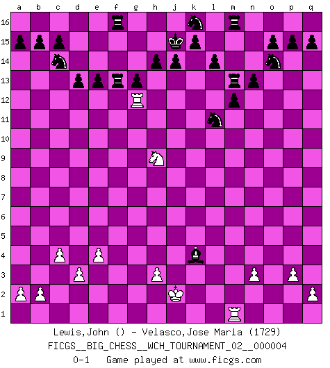 Last move : 0-1 2013 April 14 23:20:0 [Event "FICGS__BIG_CHESS__WCH_TOURNAMENT_02__000004"] [Site "FICGS"] [Date "2013.02.11"] [Round "1"] [White "Lewis,John"] [Black "Velasco,Jose Maria"] [Result "0-1"] [WhiteElo ""] [BlackElo "1729"] 1.e2-e4 j15-k13 2.f1-c4 n15-n14 3.e1-e3 h16-o10 4.j2-h4 o10-o2 5.e3-f3 g16-f14 6.h2-j4 o16-d6 7.g2-g3 o2-o11 8.p2-p3 d15-d13 9.o1-p2 e15-e13 10.m1-o1 o11-q13 11.j4-h6 p16-o14 12.p2-k7 c16-l8 13.k7-l8 q13-l8 14.k1-l3 l8-l6 15.p1-o3 l6-h6 16.l3-k5 h6-h7 17.d2-d3 f16-b12 18.b1-c3 m15-m13 19.l2-l4 n14-n13 20.f3-f7 h7-n12 21.n2-n3 l16-n14 22.f7-b7 b16-c14 23.c3-d5 m13-m12 24.c4-b5 l15-l14 25.d5-c7 n14-h9 26.k5-j7 h9-f11 27.b7-a7 d6-c5 28.a7-a10 c5-f2 29.g1-f3 f2-g3 30.j1-k1 n12-n4 31.k1-j2 n4-l4 32.k2-k3 l4-l2 33.l1-k2 g3-c7 34.o3-m4 l2-m2 35.h1-g2 f11-q1 36.o1-q1 b12-l3 37.a10-l10 m2-k2 38.j2-h1 l3-m4 39.g2-k2 m4-k2 40.q1-m1 k2-j3 41.c2-c4 h15-j13 42.c1-h6 c7-d8 43.h4-g6 k13-l11 44.f3-g5 j3-g5 45.h6-g5 d8-g5 46.l10-g10 f14-g12 47.b5-a6 f15-f13 48.a1-g1 g5-e3 49.g1-g4 m16-m13 50.j7-h9 g15-g13 51.a6-g12 j13-g12 52.g10-k10 e3-d4 53.h9-g11 d4-k10 54.g11-f13 j16-j15 55.g6-f8 e16-f16 56.g4-g12 f16-f13 57.f8-h9 k10-h12 58.h1-g2 a16-f16 59.g2-h2 h12-n7 60.k3-k4 n7-k4 61.h2-j2 q16-m16 0-1 Follow this game move after move (download)Only the player with the initiative has the right to attack. (Wilhelm Steinitz) Der Bart als Geschlechtszeichen mitten im Gesicht ist obszön. Daher gefällt er den Weibern. [Zugegeben, kein Schachzitat, aber unglaublich originell] (Arthur Schopenhauer) Con el tiempo, empecé a progresar en partidas decisivas. Tal vez porque me di cuenta de una simple verdad: no solo estaba yo nervioso sino también mi oponente. (Mikhail Tal) Les Cavaliers se révèlent fort utiles dans les positions fermées. D'habitude, les Fous sont un peu plus forts que les Cavaliers dans les positions ouvertes. Qu'on le veuille ou non, il restera toujours des exceptions ! Luck has a peculiar habit of favoring those who don't depend on it. (Author unknown)