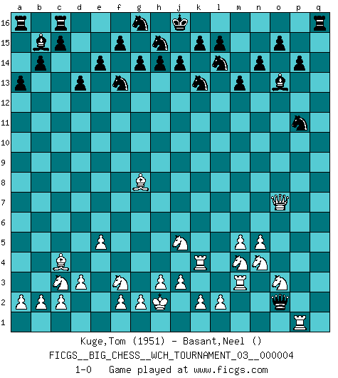 Last move : 1-0 2013 April 5 5:58:1 [Event "FICGS__BIG_CHESS__WCH_TOURNAMENT_03__000004"] [Site "FICGS"] [Date "2013.02.11"] [Round "1"] [White "Kuge,Tom"] [Black "Basant,Neel"] [Result "1-0"] [WhiteElo "1951"] [BlackElo ""] 1.j2-k4 p16-o14 2.e2-e4 e15-e14 3.f1-c4 p15-p14 4.d2-d3 d15-d13 5.c1-p13 o16-p15 6.b1-c3 f16-d14 7.m2-m4 g15-g14 8.n2-n4 b15-b14 9.k1-l3 c16-b15 10.p1-o3 h16-e13 11.h1-p8 m15-m13 12.g1-f3 b16-c14 13.l1-p5 l16-o13 14.p8-f8 q16-n16 15.m4-m5 c14-e15 16.p5-j11 k16-l14 17.o1-g8 j15-k13 18.j11-g9 n15-n14 19.k4-l6 q15-q14 20.p13-g5 e15-f13 21.n4-n5 a15-a13 22.e4-e5 d14-c13 23.g9-h10 e13-f14 24.h2-k3 c13-b12 25.f8-c8 b12-c13 26.h10-k8 c13-d14 27.k8-q14 p15-q14 28.g5-q14 o14-q13 29.q14-k8 d14-k8 30.l6-k8 e16-c16 31.k3-j5 f14-m8 32.k8-l6 m8-h8 33.m1-m4 q13-p11 34.l3-n4 n16-q16 35.m4-k4 q16-q8 36.c8-c7 h8-p8 37.q1-m1 m16-q16 38.j1-h2 p8-p2 39.n4-p5 p2-o2 40.l6-m4 o2-n3 41.c7-o7 q8-q2 42.m1-m3 n3-o2 43.e1-p1 q2-p2 44.p1-p2 o2-p2 45.a1-p1 p2-o2 46.p5-n4 1-0 Follow this game move after move (download)The stomach is an essential part of the Chess master. (Bent Larsen) Drei Punkte vor allen anderen ist wie einer, der im weißen Anzug posiert, während der Rest in Müllsäcke gekleidet dasteht. (Viktor Kortschnoi) La enorme capacidad mental, en la que sin ella no puede un jugador de Ajedrez existir, es demasiado requerida por el Ajedrez al grado de que nunca podrá liberar su mente de este juego. (Albert Einstein) Des combinaisons [dans le jeu d'échecs] pareilles à des mélodies. Je crois entendre pour ainsi dire la musique des coups... (Vladimir Nabokov) Man with more than one clock never knows what time it is. (Chinese thought)