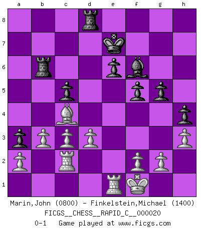 Last move : 0-1 2007 April 25 0:37:41 [Event "FICGS__CHESS__RAPID_C__000020"] [Site "FICGS"] [Date "2007.01.26"] [Round "1"] [White "Marin,John"] [Black "Finkelstein,Michael"] [Result "0-1"] [WhiteElo "0800"] [BlackElo "1400"] 1.e4 d5 2.exd5 Qxd5 3.Nf3 Bg4 4.Nc3 Qe6+ 5.Qe2 Qxe2+ 6.Bxe2 Nc6 7.h3 Bxf3 8.Bxf3 e6 9.O-O Nf6 10.d3 Bc5 11.Ne4 Nxe4 12.Bxe4 Nd4 13.Be3 f5 14.Bxb7 Rb8 15.Bxd4 Bxd4 16.Bc6+ Ke7 17.c3 Bf6 18.Rab1 Rb6 19.Ba4 c5 20.Bb3 a5 21.Rfc1 Rd8 22.Bc4 a4 23.Rc2 a3 24.b3 h5 25.Re1 h4 26.Kf1 g5 0-1 This chess game has been lost on time (started : 2007.01.26 15:32:5) Scandinavian (centre counter) defense Kingside Castling by player White (move 9) Player Black won this chess game. Follow this game move after move (download)A player surprised is half beaten. (Proverb) Habe Mut, dich deines eigenen Verstandes zu bedienen. (Immanuel Kant) ¿Que sería del Ajedrez sin errores graciosos?. (Kurt Richter) Les échecs, c'est l'imagination. (David Bronstein) The leaves of memory seemed to make a mournful rustling in the dark. (Henry Wadsworth Longfellow)