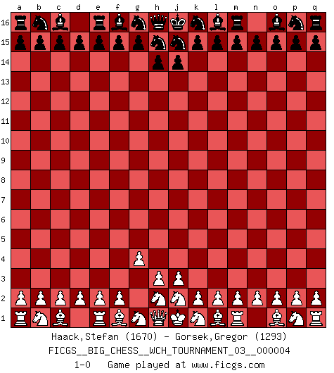Last move : 1-0 2013 March 17 6:6:10 [Event "FICGS__BIG_CHESS__WCH_TOURNAMENT_03__000004"] [Site "FICGS"] [Date "2013.02.11"] [Round "1"] [White "Haack,Stefan"] [Black "Gorsek,Gregor"] [Result "1-0"] [WhiteElo "1670"] [BlackElo "1293"] 1.g2-g4 1-0 This big chess game has been lost on time (started : 2013.02.11 20:22:44) Follow this game move after move (download)Robert Fischer is a law unto himself. (Larry Evans) Ein bischen Romantik kann weder im Schach noch in der Liebe schaden. Also versuche ich mich ab und zu daran zu erinnern. (Nigel Short) Los Peones son nacidos libres, y aún así, se encuentran encadenados por todos lados. (Rick Kennedy) Fischer est le meilleur joueur du monde et Karpov n'est qu'un joueur de bistrot. (Garry Kasparov, agé de 16 ans) The Internet is the world's largest library. It's just that all the books are on the floor. (John Allen Paulos)