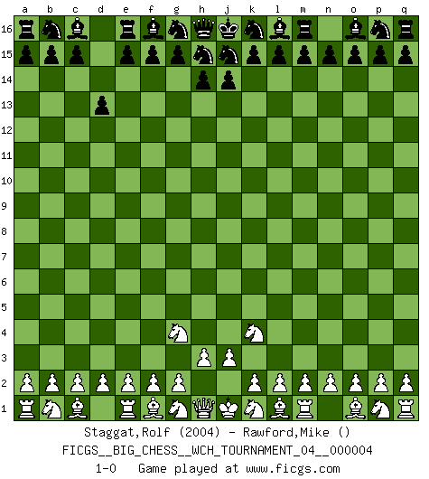 Last move : 1-0 2013 March 16 5:57:10 [Event "FICGS__BIG_CHESS__WCH_TOURNAMENT_04__000004"] [Site "FICGS"] [Date "2013.02.11"] [Round "1"] [White "Staggat,Rolf"] [Black "Rawford,Mike"] [Result "1-0"] [WhiteElo "2004"] [BlackElo ""] 1.j2-k4 d15-d13 2.h2-g4 1-0 This big chess game has been lost on time (started : 2013.02.11 20:24:6) Follow this game move after move (download)The Pin is mightier than the sword. (Fred Reinfeld) Im Blitz ist es einfacher mit einer Figur weniger anzugreifen, als sich mit einer Mehrfigur zu verteidigen. (Mikhail Nekhemyevich Tal) Un jugador que trata de regresar una movida en el Ajedrez es un futuro carterista. (Richard Fenton) Le pion, dans sa simplicité, marche droit devant lui, mais lorsqu'il prend, il le fait obliquement? Ainsi l'homme, tant qu'il reste pauvre, marche dans la droiture et vit honnêtement, mais lorsqu'il recherche les honneurs, il flatte, se parjure et, par les voies obliques, cherche une position supérieure sur l'échiquier du monde. (Jean de Galles) Everybody lies. (Gregory House, House M.D.)