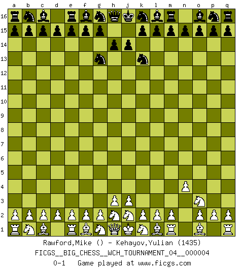Last move : 0-1 2013 March 16 5:57:10 [Event "FICGS__BIG_CHESS__WCH_TOURNAMENT_04__000004"] [Site "FICGS"] [Date "2013.02.11"] [Round "1"] [White "Rawford,Mike"] [Black "Kehayov,Yulian"] [Result "0-1"] [WhiteElo ""] [BlackElo "1435"] 1.n2-n4 j15-k13 2.p1-o3 h15-g13 0-1 This big chess game has been lost on time (started : 2013.02.11 20:24:6) Follow this game move after move (download)Do you realize Fischer almost never has any bad pieces? He exchanges them, and the bad pieces remain with his opponents. (Yuri Balashov) Obwohl ich alt bin, darf mir niemand den Finger in den Mund stecken, sonst beisse ich. (Wilhelm Steinitz) Nunca antes ha habido un jugador de Ajedrez con tal conocimiento a fondo de las complejidades del juego y una inmensa voluntad absolutamente indomable de ganar. Yo pienso que Fischer es el jugador mas grande que jamás haya existido. (Lisa Lane) Même un GMI sait rarement calculer sur plus de cinq coups une attaque à sacrifices. (Rudolf Spielmann) No, no, you're not thinking; you're just being logical. (Niels Bohr)