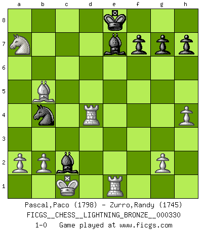 Last move : 1-0 2013 February 12 4:23:41 [Event "FICGS__CHESS__LIGHTNING_BRONZE__000330"] [Site "FICGS"] [Date "2013.02.12"] [Round "1"] [White "Pascal,Paco"] [Black "Zurro,Randy"] [Result "1-0"] [WhiteElo "1798"] [BlackElo "1745"] 1.e4 e5 2.d4 Qh4 3.Nf3 Qxe4+ 4.Be3 exd4 5.Qxd4 Qxd4 6.Nxd4 Nf6 7.Nc3 Bc5 8.Ncb5 O-O 9.Nxc7 Nd5 10.Nxa8 Nxe3 11.fxe3 Re8 12.O-O-O Rxe3 13.Nf5 d5 14.Nxe3 Bg4 15.Rxd5 Bxe3+ 16.Kb1 Bg5 17.h4 Be7 18.Nc7 Nc6 19.Ne8 Nb4 20.Rd4 Bf5 21.Bc4 Bxc2+ 22.Kc1 Kf8 23.Nc7 b5 24.Nxb5 Ke8 25.Nxa7 Bc5 26.Re1+ Be7 27.Bb5+ 1-0 King's pawn game Kingside Castling by player Black (move 8) Queenside Castling by player White (move 12) Player White won this chess game. Follow this game move after move (download)There are tough players and nice guys, and I'm a tough player. (Bobby Fischer) Das typische an einem Großmeister ist, daß er eine gewonnene Position schnell und schmerzlos gewinnt. (Irving Chernev) Alekhine es un poeta que crea un trabajo de arte de algo que raramente inspiraría a otra persona a mandar una tarjeta postal. (Max Euwe) Nous sommes les pions de la mystérieuse partie d'Echecs jouée par Dieu. Il nous déplace, nous arrête, nous pousse encore, puis nous lance un à un dans la boîte du Néant. Epitaphe sur la tombe de David Janowsky (1868-1927). Computers have lots of memory but no imagination. (Anonymous)