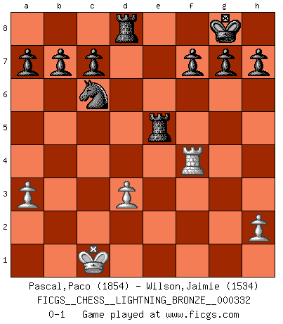 Last move : 0-1 2013 February 12 15:50:9 [Event "FICGS__CHESS__LIGHTNING_BRONZE__000332"] [Site "FICGS"] [Date "2013.02.12"] [Round "1"] [White "Pascal,Paco"] [Black "Wilson,Jaimie"] [Result "0-1"] [WhiteElo "1854"] [BlackElo "1534"] 1.e4 e6 2.Nf3 d5 3.Nc3 Nf6 4.exd5 exd5 5.d4 Bb4 6.a3 Bxc3+ 7.bxc3 O-O 8.c4 Re8+ 9.Be3 Ng4 10.Bd3 dxc4 11.Bxc4 Nxe3 12.fxe3 Rxe3+ 13.Kd2 Re8 14.Ne5 Qxd4+ 15.Kc1 Qxa1+ 16.Kd2 Qxd1+ 17.Kxd1 Rxe5 18.Rf1 Be6 19.Bd3 Nc6 20.g4 Bxg4+ 21.Kc1 Be2 22.Rf4 Bxd3 23.cxd3 Rd8 0-1 French defense Kingside Castling by player Black (move 7) Player Black won this chess game. Follow this game move after move (download)The hardest game to win is a won game. (Emanuel Lasker) Ich moechte nie einem Club beitreten, der Leute wie mich als Mitglieder aufnimmt. (Woody Allen) Cada Peón es potencialmente una Reina. (James Mason) Aux échecs, l'amour-propre est satisfait quand on remporte la victoire, mais il n'y a pas de honte à être battu. (Benjamin Franklin) You think that education is too expensive ? Try ignorance. (Derek Bok)