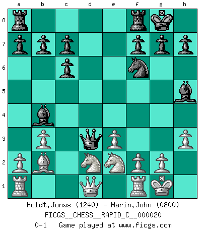 Last move : 0-1 2007 March 19 19:27:11 [Event "FICGS__CHESS__RAPID_C__000020"] [Site "FICGS"] [Date "2007.01.26"] [Round "1"] [White "Holdt,Jonas"] [Black "Marin,John"] [Result "0-1"] [WhiteElo "1240"] [BlackElo "0800"] 1.b3 e5 2.Bb2 Nc6 3.e3 Nf6 4.Bb5 e4 5.Bxc6 dxc6 6.Ne2 Bg4 7.h3 Bh5 8.O-O Bb4 9.d3 O-O 10.Nd2 exd3 11.cxd3 Qxd3 0-1 This chess game has been lost on time (started : 2007.01.26 15:32:5) Nimzovich-Larsen attack : Modern variation Kingside Castling by player White (move 8) Kingside Castling by player Black (move 9) Player Black won this chess game. Follow this game move after move (download)A thorough understanding of the typical mating continuations makes the most complicated sacrificial combinations leading up to them not only not difficult, but almost a matter of course. (Siegbert Tarrasch) Karpov ist ein Museumsstück. (Garry Kasparov) El ganador de una partida es aquel jugador que hace el penúltimo error. (Savielly Tartakover) Les Echecs, c'est l'art de la guerre sans les charniers, c'est la résurrection des morts tombés au champ d'honneur, l'espoir perpétuel, la suprématie de l'intelligence sur la force, la culture de l'esprit. (F. Szpiner) The greatest con, that he ever pulled... was making you believe... that he is you. (Revolver, movie)
