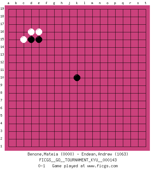 Last move : 0-1 2013 March 18 18:19:13 [Event "FICGS__GO__TOURNAMENT_KYU__000143"] [Site "FICGS"] [Date "2013.02.12"] [Round "1"] [Black "Benone,Mateia"] [White "Endean,Andrew"] [Result "0-1"] [Rating 1 "0000"] [Rating 2 "1063"] 1.k10 d16 2.d15 c15 3.e15 e16 0-1 This go game has been lost on time (started : 2013.02.12 17:20:41) Here are the names of the openings (joseki) played in the four corners : Corner d16 : d16 d15 Hoshi (Hwajeom, Seongjeom, Xingwei`) 4-4 Point. The star or hoshi (4-4) point, emphasizing influence at the potential expense of territory. Player White won this Go (weiqi, baduk) game. Follow this game move after move (download)Don't disturb symmetry. (Anonymous) Mac users swear by their computers. PC users swear at their computers. (Author unknown)