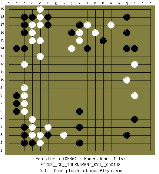 Last move : 0-1 2013 May 23 11:14:40 [Event "FICGS__GO__TOURNAMENT_KYU__000143 "] [Site "FICGS"] [Date "2013.02.12"] [Round "1"] [Black "Paul,Chris "] [White "Ruder,John "] [Result "0-1"] [Rating 1 "0586"] [Rating 2 "1115"] 1.q16 d4 2.q3 d16 3.f3 c7 4.c3 d3 5.c4 d5 6.d2 e2 7.c2 e3 8.b6 c6 9.b7 c8 10.b8 c9 11.k4 f4 12.r5 h3 13.k2 o17 14.q14 k16 15.q18 r12 16.r14 r8 17.c14 c12 18.f17 e15 19.c17 d17 20.c16 d15 21.b14 e13 22.d18 e18 23.c18 e17 24.k6 q10 25.n15 m16 26.l14 j14 27.k17 l17 28.j16 k15 29.f18 e19 0-1 This go game has been lost on time (started : 2013.02.12 17:20:41) Here are the names of the openings (joseki) played in the four corners : Corner d4 : d4 f3Hoshi (Hwajeom, Seongjeom, Xingwei`) 4-4 Point. The star or hoshi (4-4) point, emphasizing influence at the potential expense of territory.Ikken Kakari (Hankan Keolch'im, Yi Gua`jiao~, 1-Space Low Approach). Black 2 is the standard approach move to the 4-4. Corner q16 : q16 o17Hoshi (Hwajeom, Seongjeom, Xingwei`) 4-4 Point. The star or hoshi (4-4) point, emphasizing influence at the potential expense of territory.Ikken Kakari (Hankan Keolch'im, Yi Gua`jiao~, 1-Space Low Approach). White 2 is the standard approach move to the 4-4. Corner d16 : d16 c14Hoshi (Hwajeom, Seongjeom, Xingwei`) 4-4 Point. The star or hoshi (4-4) point, emphasizing influence at the potential expense of territory.Ikken Kakari (Hankan Keolch'im, Yi Gua`jiao~, 1-Space Low Approach). Black 2 is the standard approach move to the 4-4. Player White won this Go (weiqi, baduk) game.Follow this game move after move (download ) Take the cutting stone on the second line. (Anonymous) Programming can only do so much before it becomes too much. (Don Groves)