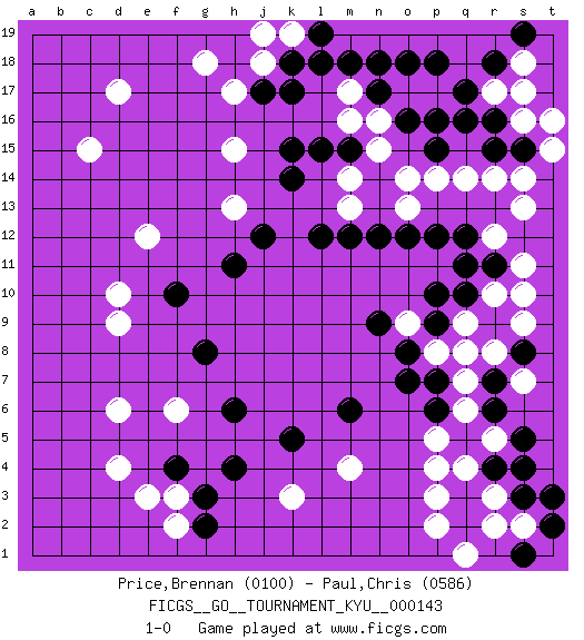 Last move : 1-0 2013 June 14 13:5:48 [Event "FICGS__GO__TOURNAMENT_KYU__000143"] [Site "FICGS"] [Date "2013.02.12"] [Round "1"] [Black "Price,Brennan"] [White "Paul,Chris"] [Result "1-0"] [Rating 1 "0100"] [Rating 2 "0586"] 1.q16 d4 2.r4 d17 3.q10 p4 4.r6 r3 5.q3 q4 6.q2 r2 7.s3 s2 8.s5 p2 9.k17 c15 10.f4 f3 11.g3 e3 12.h4 d6 13.t2 p3 14.s1 q1 15.t3 k3 16.k5 r14 17.r15 q14 18.o16 s10 19.r11 s11 20.p12 r12 21.q12 s13 22.s15 o14 23.n12 m14 24.l12 q9 25.r9 r10 26.q11 r8 27.p9 q8 28.p7 p8 29.o8 o9 30.p10 q7 31.r7 q6 32.q5 p5 33.s8 s9 34.p6 r5 35.s4 s7 36.o7 m4 37.m6 f6 38.h6 d10 39.f10 d9 40.n9 h17 41.k15 h15 42.k14 h13 43.h11 e12 44.g8 j18 45.k18 k19 46.l19 j19 47.l18 o13 48.o12 m13 49.m12 m16 50.m15 n15 51.l15 n16 52.p15 p14 53.n17 m17 54.m18 o17 55.n18 p17 56.p16 r17 57.q17 s14 58.p18 t15 59.o18 s16 60.r16 s18 61.r18 s17 62.s19 t16 63.j17 g18 64.j12 f2 65.g2 1-0 This go game has been lost on time (started : 2013.02.12 17:20:41) Here are the names of the openings (joseki) played in the four corners : Corner q4 : r4 p4 Komoku (Somok, Xiao~mu`) 3-4 Point. The komoku (3-4) point is the traditional corner enclosure move.. Ikken Takagakari (Hankan Nop'dakeolch'im, Yi Gaogua`jiao~, 1-Space High Approach). The 5-4 approach move has become more popular in modern times, as modern Go emphasizes speed and influence. Corner d4 : d4 f4 Hoshi (Hwajeom, Seongjeom, Xingwei`) 4-4 Point. The star or hoshi (4-4) point, emphasizing influence at the potential expense of territory. Ikken Takagakari (Hankan Nop'dakeolch'im, Yi Gaojia, 1-Space High Approach). White typically responds at 6-4 or 3-10. White 4-10 is played when White finds play on the right side advantageous. White 4-8 or 3-8 may be played when White has support at top. Corner q16 : q16 r14 Hoshi (Hwajeom, Seongjeom, Xingwei`) 4-4 Point. The star or hoshi (4-4) point, emphasizing influence at the potential expense of territory. Ikken Kakari (Hankan Keolch'im, Yi Gua`jiao~, 1-Space Low Approach). White 2 is the standard approach move to the 4-4. Player Black won this Go (weiqi, baduk) game. Follow this game move after move (download)A meijin needs no joseki. (Anonymous) Horse racing is animated roulette. (Roger Kahn)