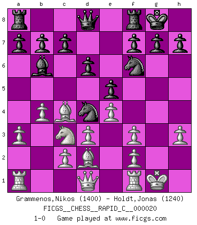 Last move : 1-0 2007 March 26 14:55:2 [Event "FICGS__CHESS__RAPID_C__000020"] [Site "FICGS"] [Date "2007.01.26"] [Round "1"] [White "Grammenos,Nikos"] [Black "Holdt,Jonas"] [Result "1-0"] [WhiteElo "1400"] [BlackElo "1240"] 1.e4 e5 2.Nf3 Nc6 3.Bc4 Nf6 4.Nc3 Bc5 5.O-O O-O 6.a3 d6 7.b4 Bb6 8.d3 Bg4 9.Bd2 Nd4 10.h3 Bxf3 11.gxf3 1-0 This chess game has been lost on time (started : 2007.01.26 15:32:5) Two knights defense Kingside Castling by player White (move 5) Kingside Castling by player Black (move 5) Player White won this chess game. Follow this game move after move (download)A Chess game is a dialogue, a conversation between a player and his opponent. Each move by the opponent may contain threats or be a blunder, but a player cannot defend against threats or take advantage of blunders if he does not first ask himself: What is my opponent planning after each move ? (Bruce A. Moon) Ich bin der einzige Schachspieler, der sich während der Vorbereitungen zum Turnier verletzt hat. (Woody Allen) No hay un Gran Maestro de Ajedrez que sea normal; solo se diferencían ellos por la magnitud de su locura. (Viktor Korchnoi) Le succès, c'est être capable d'aller d'échec en échec sans perdre son enthousiasme. (Winston Churchill) Art is the only way to run away without leaving home. (Twyla Tharp)