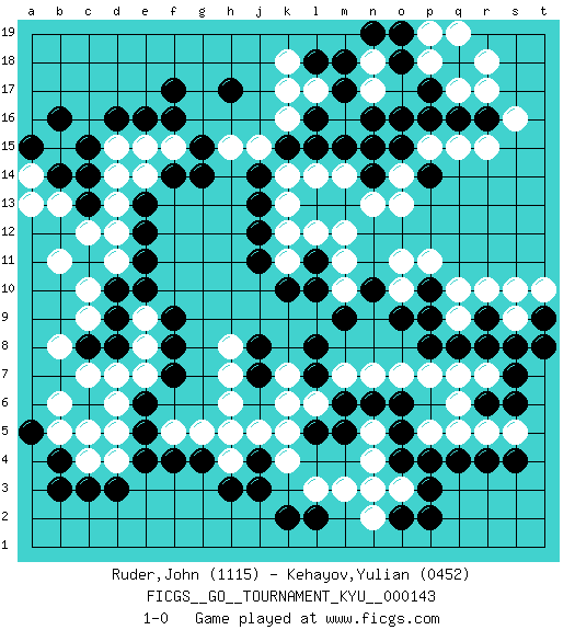 Last move : 1-0 2013 June 6 12:48:58 [Event "FICGS__GO__TOURNAMENT_KYU__000143"] [Site "FICGS"] [Date "2013.02.12"] [Round "1"] [Black "Ruder,John"] [White "Kehayov,Yulian"] [Result "1-0"] [Rating 1 "1115"] [Rating 2 "0452"] 1.q4 c5 2.d16 r15 3.k10 q17 4.d3 d4 5.e4 d5 6.c3 c7 7.d10 o3 8.p3 m3 9.o4 n4 10.o2 n3 11.o5 n5 12.j3 n2 13.p2 q10 14.r8 k16 15.l2 l3 16.k2 n7 17.o9 o11 18.m9 d13 19.f17 m12 20.l7 l6 21.m6 m7 22.l5 k6 23.m5 k5 24.n6 o7 25.o6 p7 26.q8 k7 27.l8 h7 28.f7 e8 29.f8 e9 30.e12 d12 31.e11 d11 32.e10 c10 33.d9 c9 34.d8 e7 35.e5 d6 36.f9 d7 37.c14 e14 38.g14 k14 39.j13 k13 40.j12 q6 41.s6 r5 42.r6 q5 43.s4 s5 44.r4 q7 45.p9 k4 46.h5 h4 47.j4 p5 48.p4 r7 49.s7 s9 50.s8 s10 51.q18 p18 52.p17 r18 53.q16 r17 54.o18 p19 55.m17 k18 56.o19 q19 57.o16 p15 58.p16 n15 59.o15 o14 60.p14 q15 61.n14 o13 62.m15 m14 63.n16 n18 64.m18 n17 65.l16 l17 66.l18 k17 67.k15 j15 68.l15 n13 69.n15 m11 70.j14 h15 71.h17 l14 72.f14 e15 73.f16 f15 74.g15 d15 75.c15 d14 76.c13 c12 77.e16 b13 78.b14 a13 79.b16 a14 80.a15 b11 81.b4 b5 82.c8 b8 83.r16 s16 84.n19 k11 85.j11 k12 86.l10 m10 87.n10 o10 88.p10 p11 89.r9 r10 90.e13 c4 91.b3 j5 92.g4 g5 93.h3 h6 94.j8 h8 95.j7 h4 96.f4 f5 97.e6 h5 98.l11 l12 99.a5 b6 100.t9 t10 101.t8 q9 102.p8 1-0 Here are the names of the openings (joseki) played in the four corners : Corner d4 : c5 d3 Mokuhazushi (Waemok, Wai`mu`) 5-3 Point. The mokuhazushi (5-3) point was popular in the Edo period in Japan (1600 - 1867). It emphasizes influence; territorially, it is inferior to the 3-4 point. Komoku Kakari. Black 2 is the standard approach because of its solidity and stability. Corner q4 : q4 o3 Hoshi (Hwajeom, Seongjeom, Xingwei`) 4-4 Point. The star or hoshi (4-4) point, emphasizing influence at the potential expense of territory. Ikken Kakari (Hankan Keolch'im, Yi Gua`jiao~, 1-Space Low Approach). White 2 is the standard approach move to the 4-4. Corner d16 : d16 d13 Hoshi (Hwajeom, Seongjeom, Xingwei`) 4-4 Point. The star or hoshi (4-4) point, emphasizing influence at the potential expense of territory. Niken Takagakari (Dukan Nop'dakeolch'im, E`r Gaojia, 2-Space High Approach). White 2 is a light approach move. Rarely played in even games, White 2 is typically employed in handicap games. Black continues with 6-4 or 3-10. In Korean Sunjang Baduk Black has a stone on 8-4. Player Black won this Go (weiqi, baduk) game. Follow this game move after move (download)At the head of two stones in a row, play hane. (Anonymous) I've lost money so fast in these clubs it's left me reeling. I've read every poker book ever written, but the only way to get better at the game is to go out and play with people who are really good. The problem is, you stand to lose a lot of money doing it. (Matt Damon)