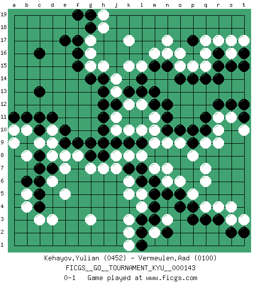 Last move : 0-1 2013 March 20 11:37:0 [Event "FICGS__GO__TOURNAMENT_KYU__000143"] [Site "FICGS"] [Date "2013.02.12"] [Round "1"] [Black "Kehayov,Yulian"] [White "Vermeulen,Aad"] [Result "0-1"] [Rating 1 "0452"] [Rating 2 "0100"] 1.r15 d3 2.c16 r4 3.e17 r17 4.c4 q16 5.p3 g3 6.c10 k17 7.r3 q4 8.q3 n3 9.o4 p5 10.n5 g17 11.c7 q7 12.m3 k3 13.r12 r10 14.c13 q15 15.r14 k5 16.p17 n17 17.o14 o15 18.n15 o16 19.p14 m2 20.m4 k10 21.l2 e5 22.f15 e7 23.e9 c3 24.g9 g7 25.h13 j8 26.h11 k12 27.p10 b4 28.c5 b5 29.b6 s3 30.s2 t3 31.t2 s4 32.n2 d6 33.c6 d8 34.c8 d9 35.e10 d10 36.d11 c9 37.b9 b10 38.c11 b8 39.b11 a10 40.d7 e8 41.a11 a9 42.q10 r9 43.r16 q17 44.q14 g15 45.g14 h15 46.f16 g16 47.f17 n7 48.l6 k6 49.l7 s16 50.s15 t17 51.n12 n9 52.n10 k15 53.g18 h18 54.f19 s11 55.s12 r11 56.q11 m16 57.m15 l15 58.m13 m11 59.n11 m10 60.h8 h7 61.j9 k8 62.k9 l8 63.l9 m9 64.g8 f8 65.f9 j10 66.h10 l10 67.h9 j11 68.h12 l5 69.m6 n6 70.m5 k2 71.l3 l4 72.l1 k1 73.o5 o6 74.p4 q6 75.k7 j7 76.t15 p15 77.l13 l12 78.k13 j13 79.h14 j14 80.l14 o9 81.o10 m7 82.t16 s17 83.m12 q9 84.t11 t10 85.t12 h19 86.g19 n16 87.p9 p8 88.j12 pass 0-1 Here are the names of the openings (joseki) played in the four corners : Corner q16 : r15 r17 Mokuhazushi (Waemok, Wai`mu`) 5-3 Point. The mokuhazushi (5-3) point was popular in the Edo period in Japan (1600 - 1867). It emphasizes influence; territorially, it is inferior to the 3-4 point. San-san. White goes for profit at the expense of influence. A ladder helps White when playing 2. Corner d4 : d3 c4 Komoku (Somok, Xiao~mu`) 3-4 Point. The komoku (3-4) point is the traditional corner enclosure move.. Corner q4 : r4 p3 Komoku (Somok, Xiao~mu`) 3-4 Point. The komoku (3-4) point is the traditional corner enclosure move.. Ikken Kakari (Hankan Keolch'im, Yi Gua`jiao~, 1-Space Low Pincer). The small knight move is the basic approach move to the 3-4 point stone. It has been continually used for over four centuries. There are limitless variations, with new moves constantly being discovered. Black 2 opens the door to a treaure store of joseki. Player White won this Go (weiqi, baduk) game. Follow this game move after move (download)The comb formation is alive. (Anonymous) O divine art of subtlety and secrecy! Through you we learn to be invisible, through you inaudible and hence we can hold the enemy's fate in our hands. (Sun Tzu)