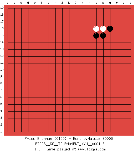 Last move : 1-0 2013 March 18 6:20:9 [Event "FICGS__GO__TOURNAMENT_KYU__000143"] [Site "FICGS"] [Date "2013.02.12"] [Round "1"] [Black "Price,Brennan"] [White "Benone,Mateia"] [Result "1-0"] [Rating 1 "0100"] [Rating 2 "0000"] 1.q16 p16 2.p15 o16 3.o15 1-0 This go game has been lost on time (started : 2013.02.12 17:20:41) Here are the names of the openings (joseki) played in the four corners : Corner q16 : q16 p16 Hoshi (Hwajeom, Seongjeom, Xingwei`) 4-4 Point. The star or hoshi (4-4) point, emphasizing influence at the potential expense of territory. Player Black won this Go (weiqi, baduk) game. Follow this game move after move (download)When in doubt, remove the enemy stones from the board. (Bill Taylor) Fame, I have already. Now I need the money. (an elderly Steinitz)