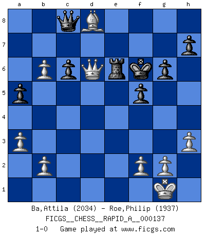 Last move : 1-0 2013 April 19 21:5:2 [Event "FICGS__CHESS__RAPID_A__000137"] [Site "FICGS"] [Date "2013.02.13"] [Round "1"] [White "Ba,Attila"] [Black "Roe,Philip"] [Result "1-0"] [WhiteElo "2034"] [BlackElo "1937"] 1.d4 Nf6 2.c4 Nc6 3.Nf3 e6 4.Nc3 Bb4 5.Qc2 d6 6.Bd2 O-O 7.a3 Bxc3 8.Bxc3 Re8 9.e3 e5 10.dxe5 dxe5 11.Rd1 Qe7 12.h3 a5 13.Be2 g6 14.O-O Bf5 15.Qc1 Ne4 16.Rd5 Be6 17.Rb5 Nd6 18.Nxe5 Nxb5 19.Nxc6 bxc6 20.cxb5 Bd5 21.Qd2 Qe4 22.Bf3 Qc4 23.e4 Bxe4 24.Qf4 f5 25.Bxe4 Qxe4 26.Qxc7 Re7 27.Qb6 Rc8 28.Re1 Qh4 29.Re3 Rxe3 30.Qxe3 Kf7 31.b6 Re8 32.Be5 Qe7 33.Bc7 Qd7 34.Qb3+ Kf6 35.Qg3 Qc8 36.Qd6+ Re6 37.Bd8+ 1-0 Kevitz-Trajkovich defense Kingside Castling by player Black (move 6) Kingside Castling by player White (move 14) Player White won this chess game. Follow this game move after move (download)War is the child of passion, passion is the child of narcissism and narcissism is the child. (...) Another game ? (Thibault de Vassal) Die Elozahlen sind sehr schlecht für das Schach. Jetzt ist Schach eine Sportindustrie, die darauf zielt Elopunkte zu machen. (Miguel Najdorf) En la perfecta combinación de Ajedrez como en una historia corta de primera clase, toda la trama y contra trama deberá conducir hacia un final sorprendente, el interes no es mitigado hasta el último momento. (Yates and Winter) J'apprécie les joueurs d'est-indienne, c'est grâce à eux que je nourris ma famille depuis tant d'années. (Petrosian) Hold em is to stud what chess is to checkers. (Johnny Moss)