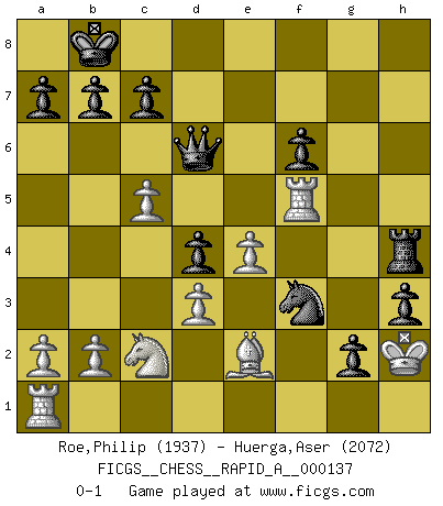 Last move : 0-1 2013 April 1 11:5:33 [Event "FICGS__CHESS__RAPID_A__000137"] [Site "FICGS"] [Date "2013.02.13"] [Round "1"] [White "Roe,Philip"] [Black "Huerga,Aser"] [Result "0-1"] [WhiteElo "1937"] [BlackElo "2072"] 1.Nc3 d5 2.e4 d4 3.Nce2 e5 4.Ng3 Be6 5.Nf3 f6 6.Be2 g6 7.d3 h5 8.Nh4 Bf7 9.c3 Nc6 10.Qa4 Qd7 11.Bd2 O-O-O 12.O-O Kb8 13.c4 g5 14.Nf3 h4 15.Nf5 Nh6 16.Nxh6 Bxh6 17.Ne1 g4 18.Bxh6 Rxh6 19.f4 exf4 20.Rxf4 Be6 21.Qc2 Ne5 22.Qd2 Rdh8 23.Nc2 g3 24.h3 Bxh3 25.gxh3 Qxh3 26.Bf1 Qd7 27.Rf5 h3 28.Qf4 g2 29.Kh2 Rh4 30.Qxh4 Rxh4 31.Be2 Qd6 32.c5 Nf3+ 0-1 Dunst (Sleipner, Heinrichsen) Opening Queenside Castling by player Black (move 11) Kingside Castling by player White (move 12) Player Black won this chess game. Follow this game move after move (download)Only the player with the initiative has the right to attack. (Wilhelm Steinitz) Das Schachspiel übertrifft alle anderen Spiele so weit wie der Chimborasso einen Misthaufen. (Arthur Schopenhauer) Siempre es mejor sacrificar los hombres de tu oponente. (Savielly Tartakower) Votre seul travail dans les ouvertures est d'obtenir un milieu de partie jouable. (Lajos Portish) It's not the will to win, but the will to prepare to win that makes the difference. (Bear Bryant)