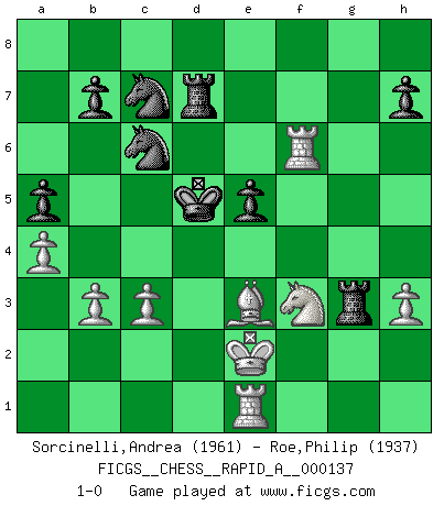 Last move : 1-0 2013 April 29 5:16:42 [Event "FICGS__CHESS__RAPID_A__000137"] [Site "FICGS"] [Date "2013.02.13"] [Round "1"] [White "Sorcinelli,Andrea"] [Black "Roe,Philip"] [Result "1-0"] [WhiteElo "1961"] [BlackElo "1937"] 1.e4 c5 2.Nf3 e6 3.d4 cxd4 4.Nxd4 a6 5.Bd3 Bc5 6.Nb3 Be7 7.Be3 d6 8.N1d2 Nf6 9.f4 Nc6 10.c3 e5 11.f5 d5 12.Qf3 g6 13.exd5 Nxd5 14.Bh6 Bxf5 15.Bxf5 gxf5 16.Qxf5 Qd6 17.O-O Qg6 18.Ne4 Rg8 19.g3 Rd8 20.Rad1 Qxf5 21.Rxf5 Rg6 22.Bc1 a5 23.a4 Rg4 24.Re1 f6 25.Nbd2 Kf7 26.h3 Rg6 27.Nf3 Nb6 28.b3 Rd3 29.Kf2 Nd5 30.Bd2 Nc7 31.Ke2 Rd7 32.Rf1 Ke6 33.Rh5 Rg7 34.Rh6 Kd5 35.Nxf6+ Bxf6 36.Rxf6 Rxg3 37.Rd1 Ke4 38.Re1 Kd5 39.Be3 1-0 Sicilian : Kan, Polugaievsky variation Kingside Castling by player White (move 17) Player White won this chess game. Follow this game move after move (download)Chess is really ninety nine percent calculation. (Soltis) Obwohl ich vom Stil her kaum zu den Priestern der Schachkunst gezählt werde, halte ich Schach doch für eine Kunst. (Tigran Petrosjan) Una buena ofensiva y una buena defensa, comienzan ambas con un buen desarrollo. (Bruce A. Moon) Il s'avisa de me proposer d'apprendre les échecs qu'il jouait un peu... me voilà forcené des échecs. J'achète un échiquier, je m'enferme dans ma chambre, j'y passe des jours et des nuits à vouloir apprendre par cur toutes les parties. (Jean-Jacques Rousseau, Confessions) Whatever you do, don't be bored. This is absolutely the most exciting time we could have possibly hoped to be alive. And things are just starting. (From movie Waking life)