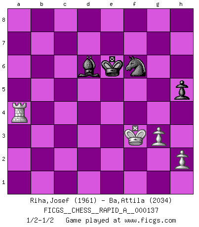 Last move : 1/2-1/2 2013 March 4 12:0:49 [Event "FICGS__CHESS__RAPID_A__000137"] [Site "FICGS"] [Date "2013.02.13"] [Round "1"] [White "Riha,Josef"] [Black "Ba,Attila"] [Result "1/2-1/2"] [WhiteElo "1961"] [BlackElo "2034"] 1.d4 d5 2.Nf3 Nf6 3.c4 c6 4.Nc3 e6 5.Qd3 dxc4 6.Qxc4 b5 7.Qd3 Bb7 8.e4 b4 9.Na4 Nbd7 10.Bg5 Qa5 11.b3 c5 12.Bxf6 gxf6 13.Be2 c4 14.Qe3 c3 15.O-O f5 16.d5 fxe4 17.dxe6 fxe6 18.Rad1 Rg8 19.Nd4 Qe5 20.a3 c2 21.Nxc2 bxa3 22.Nd4 Rc8 23.Bb5 Bd6 24.g3 Rg7 25.b4 a2 26.Qa3 Qd5 27.Nc5 Rxc5 28.Nxe6 Qxe6 29.bxc5 Bf8 30.Qxa7 Bc6 31.Bxc6 Qxc6 32.Qxa2 Bxc5 33.Qd5 Qxd5 34.Rxd5 Rf7 35.Kg2 Ke7 36.f4 exf3+ 37.Rxf3 Rxf3 38.Kxf3 Bd6 39.Rh5 Nf6 40.Rh4 h5 41.Ra4 Ke6 1/2-1/2 Queen's pawn game Kingside Castling by player White (move 15) 10 pieces endgame at move 37 : White KRRPP , Black KRBNP WHITE : King + 2 Rooks 2 Pawns BLACK : King + 1 Rook 1 Bishop 1 Knight 1 Pawn 9 pieces endgame at move 37 : White KRPP , Black KRBNP WHITE : King + 1 Rook 2 Pawns BLACK : King + 1 Rook 1 Bishop 1 Knight 1 Pawn 8 pieces endgame at move 38 : White KRPP , Black KBNP WHITE : King + 1 Rook 2 Pawns BLACK : King + 1 Bishop 1 Knight 1 Pawn This chess game ended in a draw. Follow this game move after move (download)I love all positions. Give me a difficult positional game, I will play it. But totally won positions, I cannot stand them. (Hein Donner) Wenn Dein Gegner dir ein Remis anbietet, versuch herauszufinden, weshalb er glaubt schlechter zu stehen. (Nigel Short) El sobresalir en el Ajedrez es un signo de una mente intrigante. (Sir Arthur Conan Doyle) Aux échecs, les retours au sommet sont rares : les dommages psychologiques consécutifs à une défaite sont trop sévères. (Daily Telegraph) Don't be irreplaceable, if you can't be replaced, you can't be promoted. (Dan Rotaru)