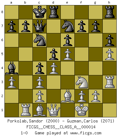 Last move : 1-0 2007 May 14 18:55:15 [Event "FICGS__CHESS__CLASS_A__000014"] [Site "FICGS"] [Date "2007.01.26"] [Round "1"] [White "Porkolab,Sandor"] [Black "Guzman,Carlos"] [Result "1-0"] [WhiteElo "2000"] [BlackElo "2071"] 1.e4 e6 2.d4 d5 3.Nc3 Bb4 4.e5 c5 5.a3 Bxc3+ 6.bxc3 Ne7 7.h4 Qc7 8.Rb1 Bd7 9.h5 h6 10.Nf3 Ba4 11.Bd3 Nbc6 12.Kf1 c4 13.Be2 O-O-O 14.Rh3 1-0 This chess game has been lost on time (started : 2007.01.26 16:40:4) French : Winawer, Advance, 6...Ne7 Queenside Castling by player Black (move 13) Player White won this chess game. Follow this game move after move (download)I am still a victim of Chess. It has all the beauty of art and much more. It cannot be commercialized. Chess is much purer than art in its social position. (Marcel Duchamp) Es ist peinlich, dass ich nie Weltmeister wurde. Es wäre leicht, Leonid Breschnjew als Ursache vorzuschieben, dessen Apparat den Vorzeigekommunisten Anatoli Karpow in allem unterstützte. Aber Garri Kasparow zum Beispiel, der ebenfalls von den Sowjets unerwünscht war, hat trotz der Widerstände den WM-Titel erobert. (Viktor Kortschnoi) Creo que una cierta cantidad de temperamento es esperada de los genios del Ajedrez. (Ron Gross) La victoire dans une partie d'Echecs appartient la plupart du temps à celui qui voit un peu plus loin que l'adversaire. (Lasker) Luck has a peculiar habit of favoring those who don't depend on it. (Author unknown)