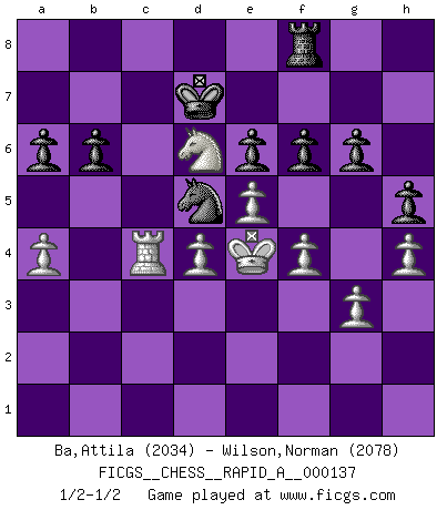 Last move : 1/2-1/2 2013 March 1 19:8:7 [Event "FICGS__CHESS__RAPID_A__000137"] [Site "FICGS"] [Date "2013.02.13"] [Round "1"] [White "Ba,Attila"] [Black "Wilson,Norman"] [Result "1/2-1/2"] [WhiteElo "2034"] [BlackElo "2078"] 1.d4 Nf6 2.c4 e6 3.Nf3 b6 4.a3 Bb7 5.Nc3 d5 6.cxd5 Nxd5 7.Qc2 Nxc3 8.bxc3 Be7 9.e4 O-O 10.Bd3 c5 11.O-O Qc8 12.Qe2 Ba6 13.Rd1 Bxd3 14.Rxd3 Nd7 15.e5 Re8 16.Bg5 Nf8 17.g3 Qa6 18.Bxe7 Rxe7 19.Ng5 Rd8 20.Ne4 cxd4 21.Qd1 Rc7 22.cxd4 Ng6 23.Nd6 Ne7 24.Rd2 Nd5 25.h4 h6 26.a4 Qa5 27.Rc2 Rxc2 28.Qxc2 Qc3 29.Qxc3 Nxc3 30.Kg2 a6 31.Ra3 Nd5 32.Rb3 h5 33.Rb1 Kf8 34.Kf3 Ke7 35.Rc1 f6 36.Ke4 Rh8 37.Rc6 Kd7 38.Rc1 Rf8 39.f4 g6 40.Rc4 1/2-1/2 Queen's Indian : Petrosian system Kingside Castling by player Black (move 9) Kingside Castling by player White (move 11) This chess game ended in a draw. Follow this game move after move (download)Only the player with the initiative has the right to attack. (Wilhelm Steinitz) In der Schule lernt man nichts. Es ist nur Zeitverschwendung. (Robert James Fischer) Algunos sacrificios son sólidos, los demás son míos. (Mikhail Tal) On n'a jamais que l'âge auquel on a commence à jouer aux échecs car après on cesse de vieillir. (Capablanca) The Internet is the world's largest library. It's just that all the books are on the floor. (John Allen Paulos)
