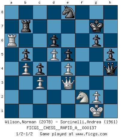 Last move : 1/2-1/2 2013 March 5 19:54:12 [Event "FICGS__CHESS__RAPID_A__000137"] [Site "FICGS"] [Date "2013.02.13"] [Round "1"] [White "Wilson,Norman"] [Black "Sorcinelli,Andrea"] [Result "1/2-1/2"] [WhiteElo "2078"] [BlackElo "1961"] 1.e4 e5 2.Nf3 Nc6 3.Bb5 a6 4.Ba4 Nf6 5.O-O Be7 6.Re1 b5 7.Bb3 d6 8.c3 O-O 9.h3 Na5 10.Bc2 c5 11.d4 Qc7 12.Nbd2 Nc6 13.d5 Nd8 14.a4 Rb8 15.b4 Bd7 16.axb5 axb5 17.Nf1 Nb7 18.Be3 Ra8 19.Bd3 c4 20.Bc2 Rfb8 21.Ba7 Rc8 22.Ra6 Nd8 23.Qa1 Qb7 24.Qa2 Ne8 25.Ng3 Nc7 26.Ra3 f6 27.Ra1 Nf7 28.Qb1 g6 29.Nd2 Bf8 30.h4 h5 31.Ndf1 Bg7 32.f3 Bh6 33.Qe1 Kh7 34.Bb1 Re8 35.Ra5 Kg7 36.Qf2 Kh7 37.Ne3 Kg8 38.Bc2 Rf8 39.R1a3 Rfe8 40.Nd1 Red8 41.Ra2 Rf8 42.Ne3 Rfd8 43.Ne2 Kh7 44.f4 exf4 45.Nxf4 Ne5 46.Bd4 Rxa5 47.Rxa5 Rf8 48.Ra7 Qb8 49.Bd1 Rf7 50.Nf1 Rg7 51.Ng3 Bxf4 52.Qxf4 Ne8 53.Ra1 Bg4 54.Bxg4 Nxg4 55.Nh1 Qd8 56.Nf2 Ne5 57.Ra6 Rb7 58.Bxe5 fxe5 59.Qf3 Qxh4 60.Qe3 Kg7 1/2-1/2 Ruy Lopez : Closed Kingside Castling by player White (move 5) Kingside Castling by player Black (move 8) This chess game ended in a draw. Follow this game move after move (download)When the Chess game is over, the Pawn and the King go back to the same box. (Irish saying) Je mehr wir mit Computern analysieren, desto mehr glauben wir an Verteidigung. (Vladimir Kramnik) Personalmente, yo prefiero mirar hacia el futuro en donde un programa de computadora gane el título mundial de Ajedrez. La humanidad necesita una lección de humildad. (Richard Dawkings) Plusieurs personnes se sont demandées comment Tal faisait pour gagner... En fait, c'est très simple ! Il met ses pièces au centre de l'échiquier et les sacrifie quelque part ! (David Bronstein) All politicians must be presumed guilty until they are proven innocent. (Dinesh De Silva)
