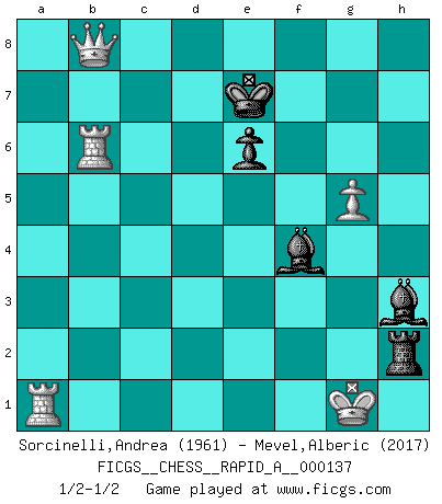 Last move : 1/2-1/2 2013 May 5 19:35:22 [Event "FICGS__CHESS__RAPID_A__000137"] [Site "FICGS"] [Date "2013.02.13"] [Round "1"] [White "Sorcinelli,Andrea"] [Black "Mevel,Alberic"] [Result "1/2-1/2"] [WhiteElo "1961"] [BlackElo "2017"] 1.e4 d5 2.exd5 Nf6 3.Bb5+ Nbd7 4.c4 a6 5.Ba4 b5 6.cxb5 Nxd5 7.Nc3 N5b6 8.Bc2 axb5 9.Nxb5 Ba6 10.Nc3 g6 11.Nge2 Bg7 12.O-O c5 13.Re1 O-O 14.d4 Rc8 15.Bg5 cxd4 16.Nxd4 Nf6 17.Bb3 Nc4 18.Bxc4 Rxc4 19.Nf3 h6 20.Bd2 e6 21.Ne5 Rc8 22.a4 Nd7 23.Nxd7 Qxd7 24.Ne4 f5 25.Bb4 Qxd1 26.Raxd1 fxe4 27.Bxf8 Kxf8 28.Rxe4 Ke7 29.Rde1 Rc6 30.b4 Bd3 31.R4e3 Bf5 32.b5 Rc4 33.b6 Rxa4 34.Rb3 Be5 35.b7 Bb8 36.f3 h5 37.Rc1 Ra2 38.h4 Rd2 39.Rb6 g5 40.hxg5 h4 41.Ra1 h3 42.gxh3 Bxh3 43.f4 Rg2+ 44.Kh1 Bxf4 45.b8Q Rh2+ 46.Kg1 1/2-1/2 Scandinavian defense Kingside Castling by player White (move 12) Kingside Castling by player Black (move 13) 10 pieces endgame at move 44 : White KRRPP , Black KRBBP WHITE : King + 2 Rooks 2 Pawns BLACK : King + 1 Rook 2 Bishops 1 Pawn Promotion Queen by player White (move 45) This chess game ended in a draw. Follow this game move after move (download)We must make sure that Chess will not be like a dead language, very interesting, but for a very small group. (Sytze Faber) Drei Punkte vor allen anderen ist wie einer, der im weißen Anzug posiert, während der Rest in Müllsäcke gekleidet dasteht. (Viktor Kortschnoi) Todo lo que importa ante el tablero de Ajedrez son buenas jugadas. (Bobby Fischer) Le plus grand jeu de l'esprit jamais inventé, plus vous l'apprenez, plus vous y prenez du plaisir. (Garry Kasparov) How many people work in NATO Headquarters ? - About half of them. (Dirk Stikker, NATO general secretary)