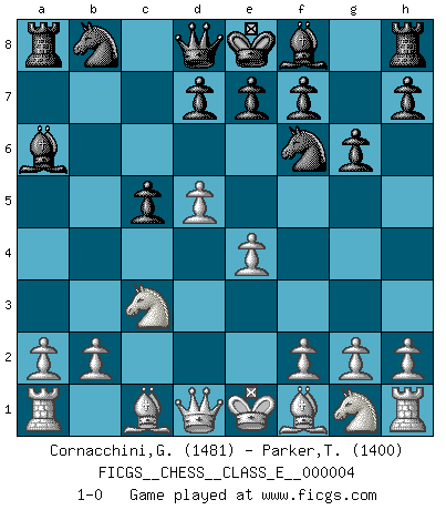 Last move : 1-0 2006 August 12 5:28:26 [Event "FICGS__CHESS__CLASS_E__000004"] [Site "FICGS"] [Date "2006.05.16"] [Round "1"] [White "Cornacchini,Gabriele"] [Black "Parker,Trent"] [Result "1-0"] [WhiteElo "1481"] [BlackElo "1400"] 1.d4 Nf6 2.c4 c5 3.d5 b5 4.cxb5 a6 5.bxa6 Bxa6 6.Nc3 g6 7.e4 1-0 This chess game has been lost on time (started : 2006.05.16 12:49:50) Benko gambit accepted Player White won this chess game. Follow this game move after move (download)Suddenly it was obvious to me in my analysis I had missed what Fischer had found with the greatest of ease at the board. (Mikhail Botvinnik) Die größte Kunst beim Schach besteht darin dem Gegner nicht zu zeigen was er tun kann. (Garry Kasparov) No nos podemos resistir a la fascinación de un sacrificio ya que la pasión por los sacrificios es parte de la naturaleza de un jugador de Ajedrez. (Rudolf Spielman) Tout change constamment, y compris dans le monde des Echecs. (Botvinnik) When you stop learning you start dying. (Scott Adams)
