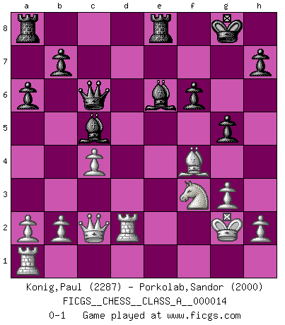 Last move : 0-1 2007 April 6 16:39:44 [Event "FICGS__CHESS__CLASS_A__000014"] [Site "FICGS"] [Date "2007.01.26"] [Round "1"] [White "Konig,Paul"] [Black "Porkolab,Sandor"] [Result "0-1"] [WhiteElo "2287"] [BlackElo "2000"] 1.c4 Nf6 2.Nf3 c5 3.d4 cxd4 4.Nxd4 e6 5.g3 d5 6.Bg2 e5 7.Nb5 a6 8.N5c3 d4 9.Ne4 Nxe4 10.Bxe4 Be7 11.Qa4+ Nd7 12.O-O O-O 13.Nd2 Nc5 14.Qc2 Nxe4 15.Qxe4 f6 16.f4 d3 17.Nf3 dxe2 18.Qxe2 exf4 19.Bxf4 Bc5+ 20.Kh1 Bh3 21.Rfd1 Qb6 22.Rd5 Rfe8 23.Qc2 Be6 24.Rd2 Qc6 25.Kg2 g5 0-1 English Opening Kingside Castling by player White (move 12) Kingside Castling by player Black (move 12) Player Black won this chess game. Follow this game move after move (download)Fischer sacrificed virtually everything most of us weakies (to use his term) value, respect, and cherish, for the sake of an artful, often beautiful board game, for the ambivalent privilege of being its greatest master. (Paul Kollar) Es gibt keine einzige Frau, der ich nicht einen Springer vorgeben könnte und trotzdem gewänne. (Robert James Fischer) La táctica fluye a partir de una posición superior. (Bobby Fischer) La vie est comme un jeu d'échecs : nous esquissons un plan, mais celui-ci est tributaire de ce que daignent faire l'adversaire aux échecs et le destin dans la vie. (Arthur Schopenhauer) The intuitive mind is a sacred gift; the rational mind is a faithful servant. We have created a society that honors the servant but has forgotten the gift. (Albert Einstein)