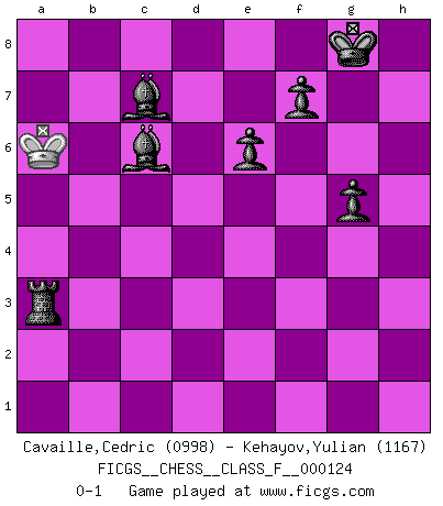 Last move : 0-1 2013 February 19 20:27:56 [Event "FICGS__CHESS__CLASS_F__000124"] [Site "FICGS"] [Date "2013.02.13"] [Round "1"] [White "Cavaille,Cedric"] [Black "Kehayov,Yulian"] [Result "0-1"] [WhiteElo "0998"] [BlackElo "1167"] 1.d4 Nf6 2.c4 e6 3.Nc3 Nc6 4.Nf3 d5 5.e3 Bb4 6.Bd2 O-O 7.Be2 Bd6 8.Qc2 Nb4 9.Qb3 dxc4 10.Qxc4 Nc2+ 11.Kd1 Nxa1 12.Kc1 a6 13.Kb1 b5 14.Qd3 b4 15.Ne4 a5 16.Nxf6+ Qxf6 17.Qe4 Qg6 18.Qxg6 hxg6 19.Kxa1 Bb7 20.g4 Rac8 21.b3 c5 22.dxc5 Rxc5 23.Nd4 Bxh1 24.Bc4 Bxh2 25.f4 Rd8 26.Kb2 g5 27.a3 gxf4 28.axb4 fxe3 29.bxc5 exd2 30.Be2 Rxd4 31.c6 d1Q 32.Bxd1 Rxd1 33.Kc2 Rg1 34.Kc3 Rxg4 35.c7 Bxc7 36.Kb2 Rg3 37.Ka3 Be5 38.Ka4 Bc6+ 39.Kxa5 Rxb3 40.Ka6 g5 41.Ka5 Bc7+ 42.Ka6 Ra3+ 0-1 Queen's pawn game Kingside Castling by player Black (move 6) Promotion Queen by player Black (move 31) 10 pieces endgame at move 35 : White KP , Black KRBBPPPP WHITE : King + 1 Pawn BLACK : King + 1 Rook 2 Bishops 4 Pawns 9 pieces endgame at move 39 : White KP , Black KRBBPPP WHITE : King + 1 Pawn BLACK : King + 1 Rook 2 Bishops 3 Pawns 8 pieces endgame at move 39 : White K , Black KRBBPPP WHITE : King + BLACK : King + 1 Rook 2 Bishops 3 Pawns Player Black won this chess game. Follow this game move after move (download)A good sacrifice is one that is not necessarily sound but leaves your opponent dazed and confused. (Rudolph Spielmann) Ihnen, Herr Lasker, habe ich nur drei Worte zu sagen: Schach und matt. (Siegbert Tarrasch) El Ajedrez es tan inspirador que yo no creo que un buen jugador sea capaz de tener un pensamiento malo durante una partida. (Wilhelm Steinitz) L'attaque fait le spectacle, la défense gagne les matchs. (Dicton footballistique) History is a gallery of pictures in which there are few originals and many copies. (Alexis de Tocqueville)