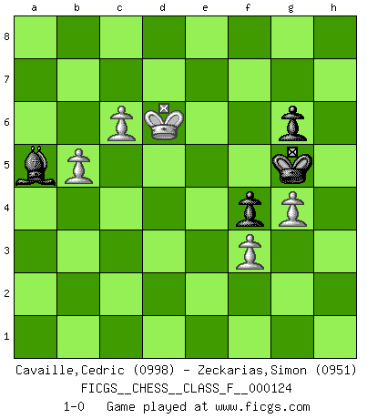 Last move : 1-0 2013 February 25 17:21:7 [Event "FICGS__CHESS__CLASS_F__000124"] [Site "FICGS"] [Date "2013.02.13"] [Round "1"] [White "Cavaille,Cedric"] [Black "Zeckarias,Simon"] [Result "1-0"] [WhiteElo "0998"] [BlackElo "0951"] 1.d4 d5 2.Nc3 Nf6 3.Bg5 Nc6 4.Bxf6 exf6 5.Nf3 Bf5 6.a3 Bg4 7.e3 f5 8.Bb5 Qd6 9.h3 Bxf3 10.Qxf3 Qe6 11.Qxd5 f4 12.Qxe6+ fxe6 13.Bxc6+ bxc6 14.exf4 Bd6 15.g3 c5 16.dxc5 Bxc5 17.b4 Bd4 18.Nb5 Bxa1 19.Nxc7+ Ke7 20.Nxa8 Rxa8 21.Kd2 Rd8+ 22.Ke2 Bc3 23.Rd1 Rxd1 24.Kxd1 h6 25.Ke2 Kf6 26.g4 Bb2 27.a4 a6 28.Kd3 Bc1 29.Ke4 Ba3 30.b5 axb5 31.axb5 Bc5 32.f3 g6 33.Kd3 e5 34.Kc4 Bb6 35.Kd5 exf4 36.Kd6 Kg5 37.c4 h5 38.c5 Ba5 39.c6 hxg4 40.hxg4 1-0 Richter-Veresov attack 10 pieces endgame at move 39 : White KPPPP , Black KBPPP WHITE : King + 4 Pawns BLACK : King + 1 Bishop 3 Pawns 9 pieces endgame at move 40 : White KPPPP , Black KBPP WHITE : King + 4 Pawns BLACK : King + 1 Bishop 2 Pawns Player White won this chess game. Follow this game move after move (download)Human affairs are like a Chess game: only those who do not take it seriously can be called good players. (Hung Tzu Ch'eng) Matt entspricht nicht immer den Tatsachen. (Savielly Grigorievitsch Tartakower) El tablero es el mundo, las piezas es el fenomeno del universo, las reglas del juego son lo que llamamos leyes de la naturaleza y el jugador del lado opuesto, se encuentra oculto a nuestra vista. (Thomas Huxley) La tactique est l'élément le plus important du milieu de jeu. (Siegbert Tarrasch) Ah, beer! The cause of, and the solution to, all of life's problems. (Homer Simpson)