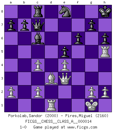 Last move : 1-0 2007 September 29 22:33:46 [Event "FICGS__CHESS__CLASS_A__000014"] [Site "FICGS"] [Date "2007.01.26"] [Round "1"] [White "Porkolab,Sandor"] [Black "Pires,Miguel"] [Result "1-0"] [WhiteElo "2000"] [BlackElo "2160"] 1.e4 c5 2.Nf3 e6 3.d4 cxd4 4.Nxd4 Qb6 5.Nb3 Nc6 6.Nc3 Nf6 7.Bd3 Bb4 8.O-O O-O 9.Be3 Qd8 10.f4 Bxc3 11.bxc3 d6 12.Qf3 Qc7 13.Qg3 Bd7 14.Rae1 Rac8 15.c4 Rfe8 16.Rd1 h6 17.f5 Kh8 18.fxe6 Rxe6 19.Nd4 Nxd4 20.Bxd4 Bc6 21.Rf5 Ne8 22.Qf4 f6 23.Rh5 Re5 24.Bxe5 dxe5 25.Qe3 1-0 This chess game has been lost on time (started : 2007.01.26 16:40:4) Sicilian defense Kingside Castling by player White (move 8) Kingside Castling by player Black (move 8) Player White won this chess game. Follow this game move after move (download)Pawns are born free, yet they are everywhere in chains. (Rick Kennedy) Jeder Schachmeister war einmal ein Anfänger. (Irving Chernev) Una buena memoria, concentración, imaginación y una fuerte voluntad, se requiere para llegar a ser un buen jugador. (Bobby Fischer) L'action d'une oeuvre littéraire se déroule sur un champ de bataille. Les masques et les types du drame moderne correspondent aux pièces du jeu d'échecs. L'intrigue correspond aux coups et aux gambits, c'est à dire aux techniques du jeu telles qu'utilisées et interprétées par les joueurs. Les tactiques et les péripéties [mouvements] correspondent aux coups exécutés par l'adversaire. (Viktor Shklovsky) Quotation,n.: The act of repeating erroneously the words of another. The words erroneously repeated. (Ambrose Bierce, The Devil's Dictionary)