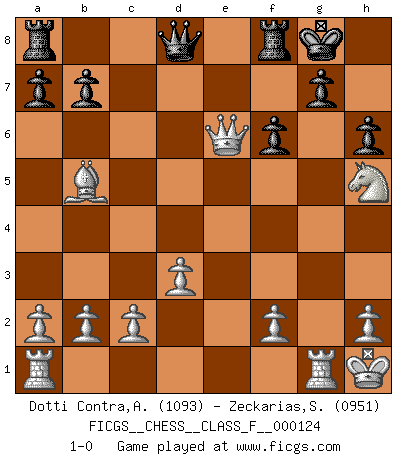 Last move : 1-0 2013 March 31 1:3:22 [Event "FICGS__CHESS__CLASS_F__000124"] [Site "FICGS"] [Date "2013.02.13"] [Round "1"] [White "Dotti Contra,Alessandro"] [Black "Zeckarias,Simon"] [Result "1-0"] [WhiteElo "1093"] [BlackElo "0951"] 1.e4 c5 2.Nf3 Nc6 3.Nc3 e5 4.Bc4 d6 5.O-O Bg4 6.d3 Nf6 7.Bg5 Nd4 8.Ne2 Bxf3 9.gxf3 Nxf3+ 10.Kh1 h6 11.Be3 d5 12.exd5 Nxd5 13.Bb5+ Ke7 14.Bxc5+ Kf6 15.Bxf8 Rxf8 16.Ng3 Kg6 17.Qxf3 Kh7 18.Qf5+ Kg8 19.Qxe5 Nc7 20.Nh5 Ne6 21.Rg1 f6 22.Qxe6+ 1-0 Sicilian defense Kingside Castling by player White (move 5) Player White won this chess game. Follow this game move after move (download)Bobby is the finest Chess player this country ever produced. His memory for the moves, his brilliance in dreaming up combinations, and his fierce determination to win are uncanny. (John Collins) Der Traum, für den ich lebe, ist der von einem freien Russland. Viele mögen sagen: Russland hat doch ein Parlament, einen gewählten Präsidenten. Aber ich spüre, dass in meiner Heimat die Angst wiederkehrt. Eine Angst, sich frei zu äußern, bestimmte Dinge zu tun (Garry Kasparov) Yo jugué Ajedrez con el y a veces le pude haber ganado solo que siempre devuelve su última jugada y juega la partida de manera diferente. (Mark Twain) Les Echecs mettent en conflit, non pas deux intelligences, mais deux volontés. (Lasker) Optimism is a variety of information deficit. Sometimes especially true for correspondence chess games. (Michael Aigner)