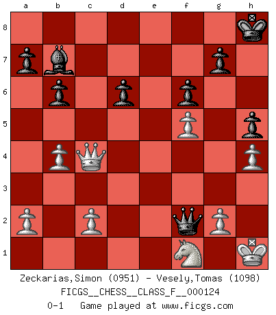 Last move : 0-1 2013 March 4 12:25:49 [Event "FICGS__CHESS__CLASS_F__000124"] [Site "FICGS"] [Date "2013.02.13"] [Round "1"] [White "Zeckarias,Simon"] [Black "Vesely,Tomas"] [Result "0-1"] [WhiteElo "0951"] [BlackElo "1098"] 1.d3 e5 2.e4 Nc6 3.Nf3 Be7 4.Nc3 b6 5.d4 Nxd4 6.Nxe5 d6 7.Nf3 Nc6 8.Bc4 Bb7 9.Bd5 Nf6 10.O-O Nxd5 11.exd5 Ne5 12.Re1 O-O 13.Bf4 Bf6 14.Nxe5 Bxe5 15.Bxe5 dxe5 16.Rxe5 Qf6 17.Qe2 Ba6 18.Qe4 Rad8 19.Re1 Qd6 20.f4 Qc5+ 21.Kh1 Bb7 22.b4 Qd6 23.f5 f6 24.Re6 Qd7 25.Qc4 Rde8 26.Rxe8 Rxe8 27.Rxe8+ Qxe8 28.d6 Kh8 29.Ne4 cxd6 30.Ng3 h5 31.h4 Qe1+ 32.Nf1 Qf2 0-1 Mieses Opening Kingside Castling by player White (move 10) Kingside Castling by player Black (move 12) Player Black won this chess game. Follow this game move after move (download)A Chess game is a dialogue, a conversation between a player and his opponent. Each move by the opponent may contain threats or be a blunder, but a player cannot defend against threats or take advantage of blunders if he does not first ask himself: What is my opponent planning after each move ? (Bruce A. Moon) Ich bin es gewohnt, das die Jugend mir überhaupt keinen Respekt entgegenbringt. (Alexander Morozewich) EL Ajedrez es como la vida. (Boris Spassky) Aux échecs, l'amour-propre est satisfait quand on remporte la victoire, mais il n'y a pas de honte à être battu. (Benjamin Franklin) . 'gn is not allowed in chess unless n is an integer between 1 and 8 inclusive, where 1 and 8 are to interpreted as the standard numerals standing for integers in the ordered real-closed field R, with the *canonical* ordering. (As opposed to, say, an integer in the domain Z[2+i*sqrt(5)] or an integer in some exotic Grothendieck topos). (Normajean Yates)