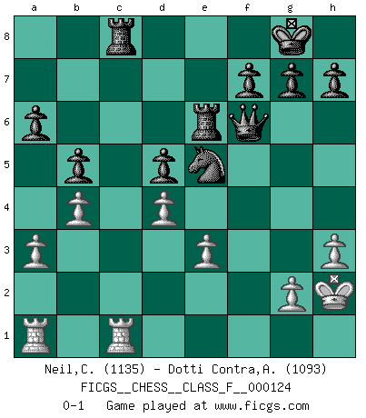 Last move : 0-1 2013 April 1 23:47:49 [Event "FICGS__CHESS__CLASS_F__000124"] [Site "FICGS"] [Date "2013.02.13"] [Round "1"] [White "Neil,Charlie"] [Black "Dotti Contra,Alessandro"] [Result "0-1"] [WhiteElo "1135"] [BlackElo "1093"] 1.d4 d5 2.c4 Bf5 3.Nc3 e6 4.cxd5 exd5 5.Bf4 Bb4 6.e3 Nf6 7.Bd3 Qd7 8.Nge2 O-O 9.h3 Nc6 10.O-O Bxd3 11.Qxd3 Rfe8 12.Nb5 Ba5 13.a3 a6 14.Nbc3 Bxc3 15.Nxc3 b6 16.b4 Ne4 17.Rfc1 b5 18.Bh2 Qf5 19.Bxc7 Qxf2+ 20.Kh2 Nxc3 21.Qxc3 Re6 22.Bg3 Qf6 23.Be5 Nxe5 24.Qc8+ Rxc8 0-1 QGD : Grau (Sahovic) defense Kingside Castling by player Black (move 8) Kingside Castling by player White (move 10) Player Black won this chess game. Follow this game move after move (download)Chess is like war on a board. (Bobby Fischer) Spielt Blackmar-Diemer-Gambit, und das Matt kommt von selbst! (Emil Joseph Diemer) Evita las multitudes. Haz independientemente tu propio razonamiento. Trata de ser el jugador de Ajedrez, no la pieza de Ajedrez. (Ralph Charell) Le plus grand jeu de l'esprit jamais inventé, plus vous l'apprenez, plus vous y prenez du plaisir. (Garry Kasparov) The smarter you play, the luckier you'll be. (Mark Pilarski)