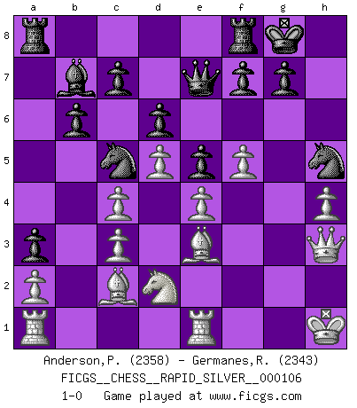 Last move : 1-0 2013 May 7 14:4:53 [Event "FICGS__CHESS__RAPID_SILVER__000106"] [Site "FICGS"] [Date "2013.02.15"] [Round "1"] [White "Anderson,Peter W."] [Black "Germanes,Ramil"] [Result "1-0"] [WhiteElo "2358"] [BlackElo "2343"] 1.d4 Nf6 2.c4 e6 3.Nc3 Bb4 4.e3 b6 5.Bd3 Bb7 6.Nf3 O-O 7.O-O Bxc3 8.bxc3 Qe7 9.Nd2 e5 10.e4 d6 11.Re1 Nc6 12.Nb3 a5 13.Be3 h6 14.Nd2 Nb8 15.f4 Nbd7 16.f5 a4 17.d5 Nc5 18.Bc2 a3 19.g4 Nfd7 20.g5 hxg5 21.h4 g4 22.Qxg4 Nf6 23.Qh3 Nh5 24.Kh1 1-0 Nimzo-Indian : Fischer variation Kingside Castling by player Black (move 6) Kingside Castling by player White (move 7) Player White won this chess game. Follow this game move after move (download)Those who say they understand Chess, understand nothing. (Robert Hubner) Die Neutralität betrachte ich als eine schwere Krankheit. (Viktor Kortschnoi) El arma más poderosa en el Ajedrez, es tener la próxima movida. (David Bronstein) Les réformistes prétendent que les progrès de la théorie conduiront à la disparition des échecs, et qu'il faut, pour leur rendre vie, en remanier les règles. En réalité, qu'exprime cette affirmation? Le mépris de l'intuition, de l'imagination et de tous les autres éléments qui font des échecs un art. (Alexander Alekhine) The worth of a book is to be measured by what you can carry away from it. (James Bryce)