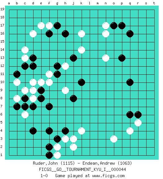 Last move : 1-0 2013 April 16 19:4:55 [Event "FICGS__GO__TOURNAMENT_KYU_I__000044 "] [Site "FICGS"] [Date "2013.02.17"] [Round "1"] [Black "Ruder,John "] [White "Endean,Andrew "] [Result "1-0"] [Rating 1 "1115"] [Rating 2 "1063"] 1.d4 d16 2.q16 q4 3.k10 d10 4.r6 r5 5.q6 o3 6.q10 k16 7.f16 f17 8.g17 e17 9.h16 n16 10.o17 n17 11.p17 k14 12.j13 n13 13.p13 k4 14.g3 h3 15.h4 j3 16.f4 g2 17.f2 g1 18.f1 j2 19.d13 c13 20.c12 c14 21.d12 c6 22.c8 d8 23.d7 c9 24.e8 d9 25.c7 b8 26.b7 b10 27.b11 f10 28.e9 e10 29.f7 h9 30.j8 h12 31.g11 f11 32.g12 1-0 Here are the names of the openings (joseki) played in the four corners : Corner q4 : q4 r6Hoshi (Hwajeom, Seongjeom, Xingwei`) 4-4 Point. The star or hoshi (4-4) point, emphasizing influence at the potential expense of territory.Ikken Kakari (Hankan Keolch'im, Yi Gua`jiao~, 1-Space Low Approach). Black 2 is the standard approach move to the 4-4. Corner d16 : d16 f16Hoshi (Hwajeom, Seongjeom, Xingwei`) 4-4 Point. The star or hoshi (4-4) point, emphasizing influence at the potential expense of territory.Ikken Takagakari (Hankan Nop'dakeolch'im, Yi Gaojia, 1-Space High Approach). White typically responds at 6-4 or 3-10. White 4-10 is played when White finds play on the right side advantageous. White 4-8 or 3-8 may be played when White has support at top. Corner q16 : q16 n16Hoshi (Hwajeom, Seongjeom, Xingwei`) 4-4 Point. The star or hoshi (4-4) point, emphasizing influence at the potential expense of territory.Niken Takagakari (Dukan Nop'dakeolch'im, E`r Gaojia, 2-Space High Approach). White 2 is a light approach move. Rarely played in even games, White 2 is typically employed in handicap games. Black continues with 6-4 or 3-10. In Korean Sunjang Baduk Black has a stone on 8-4. Player Black won this Go (weiqi, baduk) game.Follow this game move after move (download ) The weak player fears ko, the strong player seeks it. (Bill Taylor) Establishing goals is all right if you don't let them deprive you of interesting detours. (Doug Larson)