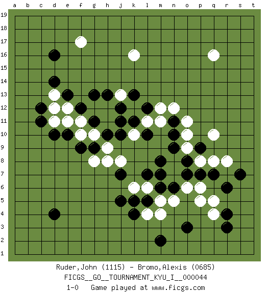 Last move : 1-0 2013 April 2 19:37:39 [Event "FICGS__GO__TOURNAMENT_KYU_I__000044"] [Site "FICGS"] [Date "2013.02.17"] [Round "1"] [Black "Ruder,John"] [White "Bromo,Alexis"] [Result "1-0"] [Rating 1 "1115"] [Rating 2 "0685"] 1.d4 q16 2.d16 q4 3.d10 q10 4.o3 k10 5.k4 k16 6.r6 p5 7.r3 f17 8.r4 q5 9.s7 r8 10.q7 q8 11.p7 p6 12.o7 o6 13.n6 n5 14.m6 m5 15.l5 m4 16.m2 l4 17.j5 l6 18.k5 n7 19.m7 n8 20.l7 k6 21.j7 h8 22.p9 p8 23.o8 o9 24.n9 o10 25.m8 j8 26.n10 o11 27.h10 h12 28.j11 k12 29.k11 l11 30.l10 m11 31.n11 n12 32.j12 j13 33.l12 m12 34.k13 h11 35.j10 g10 36.g9 g8 37.f9 f10 38.e10 f11 39.f12 e11 40.g13 g12 41.h13 e12 42.g11 h9 43.e13 d11 44.c11 d12 45.c12 d13 46.d14 1-0 Here are the names of the openings (joseki) played in the four corners : Corner q4 : q4 o3 Hoshi (Hwajeom, Seongjeom, Xingwei`) 4-4 Point. The star or hoshi (4-4) point, emphasizing influence at the potential expense of territory. Ikken Kakari (Hankan Keolch'im, Yi Gua`jiao~, 1-Space Low Approach). Black 2 is the standard approach move to the 4-4. Corner d16 : d16 f17 Hoshi (Hwajeom, Seongjeom, Xingwei`) 4-4 Point. The star or hoshi (4-4) point, emphasizing influence at the potential expense of territory. Ikken Kakari (Hankan Keolch'im, Yi Gua`jiao~, 1-Space Low Approach). White 2 is the standard approach move to the 4-4. Player Black won this Go (weiqi, baduk) game. Follow this game move after move (download)Studying go is a wonderful way to develop both the creative as well as the logical abilities of children because to play it both sides of the brain are necessary. (Cho Chikun) The leaves of memory seemed to make a mournful rustling in the dark. (Henry Wadsworth Longfellow)