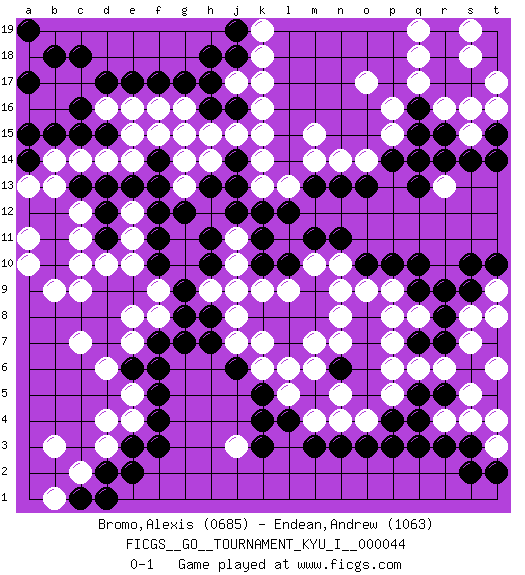Last move : 0-1 2013 May 2 9:3:56 [Event "FICGS__GO__TOURNAMENT_KYU_I__000044"] [Site "FICGS"] [Date "2013.02.17"] [Round "1"] [Black "Bromo,Alexis"] [White "Endean,Andrew"] [Result "0-1"] [Rating 1 "0685"] [Rating 2 "1063"] 1.q16 d4 2.q4 d16 3.k4 d10 4.q10 k16 5.k10 o17 6.g7 r6 7.n13 m15 8.j13 h15 9.g12 e12 10.f10 e8 11.e6 d6 12.f4 e5 13.f5 e7 14.f6 e4 15.e3 d3 16.f3 p7 17.q7 q6 18.r7 p5 19.p4 s7 20.r8 r4 21.r3 s4 22.s3 s8 23.s9 q8 24.r9 p9 25.p10 o9 26.o10 n10 27.n11 m10 28.m11 l9 29.l10 k9 30.j9 j8 31.h8 j7 32.h7 l6 33.j6 k6 34.k5 l5 35.l4 m4 36.m3 n4 37.n3 o4 38.o3 l11 39.l12 j10 40.k11 h9 41.h11 j11 42.j12 o14 43.o13 n14 44.p14 p15 45.q15 p16 46.f17 f16 47.g17 g16 48.h17 j17 49.e17 e16 50.d17 c17 51.c18 b17 52.b18 g13 53.h13 h14 54.f13 g14 55.e13 e11 56.f12 d14 57.d13 e14 58.f14 f15 59.f11 e10 60.a17 a16 61.c16 b16 62.c15 c14 63.b15 a18 64.a15 b14 65.a17 k14 66.j14 j15 67.h16 q17 68.r17 q18 69.r18 q19 70.r19 r16 71.r15 s16 72.s17 s15 73.q14 t17 74.s14 s18 75.t15 s19 76.h10 j9 77.g9 f9 78.g8 f8 79.q5 p6 80.q9 p8 81.r5 s5 82.q3 t9 83.t10 t8 84.s10 t3 85.t2 t4 86.s2 t6 87.j18 k18 88.j19 k19 89.h18 c12 90.c13 b13 91.d2 c2 92.e2 b3 93.c1 b1 94.d1 t16 95.t14 k13 96.k12 l13 97.m13 m14 98.d15 e15 99.a14 a13 100.j16 k17 101.d12 c11 102.d11 c9 103.f7 c7 104.m9 n9 105.m8 m7 106.l8 k7 107.l7 n7 108.m5 n5 109.b12 g15 110.a12 k15 111.b11 c10 112.b10 b9 113.k8 n8 114.n6 m6 115.a19 a10 116.p3 j3 117.k3 r13 118.r14 a11 119.q13 pass 120.pass pass 0-1 Here are the names of the openings (joseki) played in the four corners : Corner q16 : q16 o17 Hoshi (Hwajeom, Seongjeom, Xingwei`) 4-4 Point. The star or hoshi (4-4) point, emphasizing influence at the potential expense of territory. Ikken Kakari (Hankan Keolch'im, Yi Gua`jiao~, 1-Space Low Approach). White 2 is the standard approach move to the 4-4. Corner d4 : d4 g7 Hoshi (Hwajeom, Seongjeom, Xingwei`) 4-4 Point. The star or hoshi (4-4) point, emphasizing influence at the potential expense of territory. Corner q4 : q4 r6 Hoshi (Hwajeom, Seongjeom, Xingwei`) 4-4 Point. The star or hoshi (4-4) point, emphasizing influence at the potential expense of territory. Ikken Kakari (Hankan Keolch'im, Yi Gua`jiao~, 1-Space Low Approach). White 2 is the standard approach move to the 4-4. Corner d16 : d16 j13 Hoshi (Hwajeom, Seongjeom, Xingwei`) 4-4 Point. The star or hoshi (4-4) point, emphasizing influence at the potential expense of territory. Player White won this Go (weiqi, baduk) game. Follow this game move after move (download)If you don't know ladders, don't play go. (Anonymous) Always two there are. No more no less. A master, and an apprentice. (Master Yoda in Star Wars ep.1)