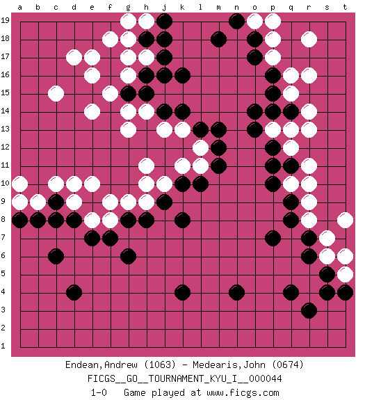 Last move : 1-0 2013 May 12 0:38:6 [Event "FICGS__GO__TOURNAMENT_KYU_I__000044"] [Site "FICGS"] [Date "2013.02.17"] [Round "1"] [Black "Endean,Andrew"] [White "Medearis,John"] [Result "1-0"] [Rating 1 "1063"] [Rating 2 "0674"] 1.q4 d17 2.d4 r16 3.p16 r13 4.k16 c15 5.c6 d10 6.k4 q10 7.k10 k13 8.m13 g13 9.h15 h14 10.j14 j13 11.k14 g14 12.g15 e14 13.f17 f15 14.f16 e16 15.q8 r8 16.r7 r9 17.q9 r10 18.p10 q13 19.o14 h17 20.j16 g16 21.h16 g17 22.j17 f18 23.h18 e17 24.d8 f9 25.f7 b9 26.b8 c10 27.h8 h10 28.l13 k11 29.l10 j10 30.j9 h9 31.k8 l11 32.m11 l12 33.m12 h11 34.g8 g9 35.e9 e10 36.p7 e8 37.e7 d9 38.c8 f8 39.g6 p17 40.o17 p18 41.o18 q16 42.p15 r18 43.p12 q12 44.q11 r11 45.p11 q15 46.q14 r14 47.p14 p13 48.o13 o19 49.n19 p19 50.m18 h19 51.j19 g19 52.j18 g18 53.r3 s7 54.r6 s6 55.s5 t8 56.c9 a10 57.a8 a9 58.n4 t5 59.t4 t6 60.s4 pass 61.pass 1-0 Here are the names of the openings (joseki) played in the four corners : Corner q16 : r16 p16 Komoku (Somok, Xiao~mu`) 3-4 Point. The komoku (3-4) point is the traditional corner enclosure move.. Ikken Takagakari (Hankan Nop'dakeolch'im, Yi Gaogua`jiao~, 1-Space High Approach). The 5-4 approach move has become more popular in modern times, as modern Go emphasizes speed and influence. Player Black won this Go (weiqi, baduk) game. Follow this game move after move (download)Territory is a closed space where time no longer exists. The transformation around it slower alter it, and sometimes it cracks open like a rotten egg at the least shock. (Pierre Audouard) The intuitive mind is a sacred gift; the rational mind is a faithful servant. We have created a society that honors the servant but has forgotten the gift. (Albert Einstein)