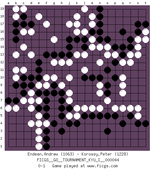 Last move : 0-1 2013 May 10 23:13:14 [Event "FICGS__GO__TOURNAMENT_KYU_I__000044"] [Site "FICGS"] [Date "2013.02.17"] [Round "1"] [Black "Endean,Andrew"] [White "Korossy,Peter"] [Result "0-1"] [Rating 1 "1063"] [Rating 2 "1228"] 1.q4 d4 2.q16 d16 3.f3 f4 4.g4 e3 5.f5 e4 6.f2 e2 7.f1 c7 8.f6 e1 9.h3 r6 10.r5 q6 11.o3 q10 12.r14 k16 13.n16 f17 14.d10 d13 15.e12 f10 16.e8 e9 17.d9 d8 18.c8 d7 19.e10 f9 20.e11 c11 21.f13 g12 22.g13 h12 23.h13 j12 24.j13 l13 25.j15 j17 26.l14 m14 27.l15 m15 28.m16 o13 29.p14 r12 30.p12 p13 31.q13 q12 32.o11 n12 33.o9 o7 34.o5 j5 35.k4 l6 36.m5 m6 37.l5 k6 38.h7 j8 39.h8 h9 40.h6 j7 41.j4 l16 42.l17 k17 43.k15 k13 44.j14 g15 45.f8 j10 46.g9 g10 47.g8 m17 48.l18 m18 49.n17 k18 50.n18 l19 51.n19 p6 52.p5 s14 53.r15 s15 54.s16 r13 55.q14 s5 56.s4 s6 57.t4 s13 58.s17 e5 59.e6 d6 60.j6 k5 61.h5 n6 62.n5 o14 63.o15 n14 64.n15 e7 65.f7 t16 66.t17 t15 67.m10 l11 68.l10 n9 69.n10 n8 70.o8 q8 71.p10 q9 72.c17 c16 73.d17 e18 74.b16 b19 75.b15 b18 76.b17 b13 77.c18 c19 78.c9 c14 79.b7 b6 80.a7 a6 81.b9 b10 82.c10 b11 0-1 Here are the names of the openings (joseki) played in the four corners : Corner d4 : d4 f3 Hoshi (Hwajeom, Seongjeom, Xingwei`) 4-4 Point. The star or hoshi (4-4) point, emphasizing influence at the potential expense of territory. Ikken Kakari (Hankan Keolch'im, Yi Gua`jiao~, 1-Space Low Approach). Black 2 is the standard approach move to the 4-4. Corner q4 : q4 r6 Hoshi (Hwajeom, Seongjeom, Xingwei`) 4-4 Point. The star or hoshi (4-4) point, emphasizing influence at the potential expense of territory. Ikken Kakari (Hankan Keolch'im, Yi Gua`jiao~, 1-Space Low Approach). White 2 is the standard approach move to the 4-4. Player White won this Go (weiqi, baduk) game. Follow this game move after move (download)Learn to play under the stones. (Anonymous) A mistake is only a mistake if you let it happen twice. Otherwise it is a learning experience. (Daniel Parmet)